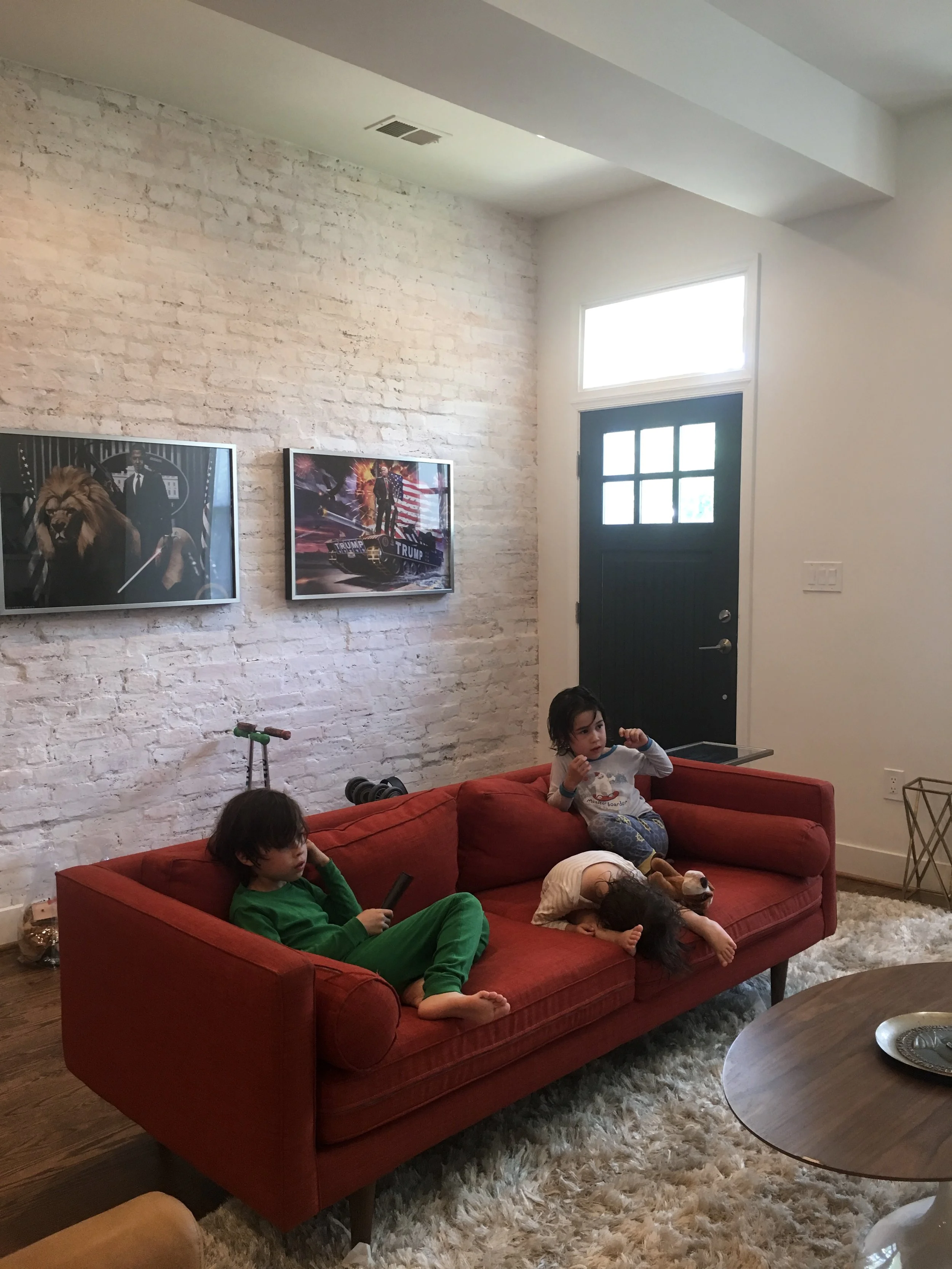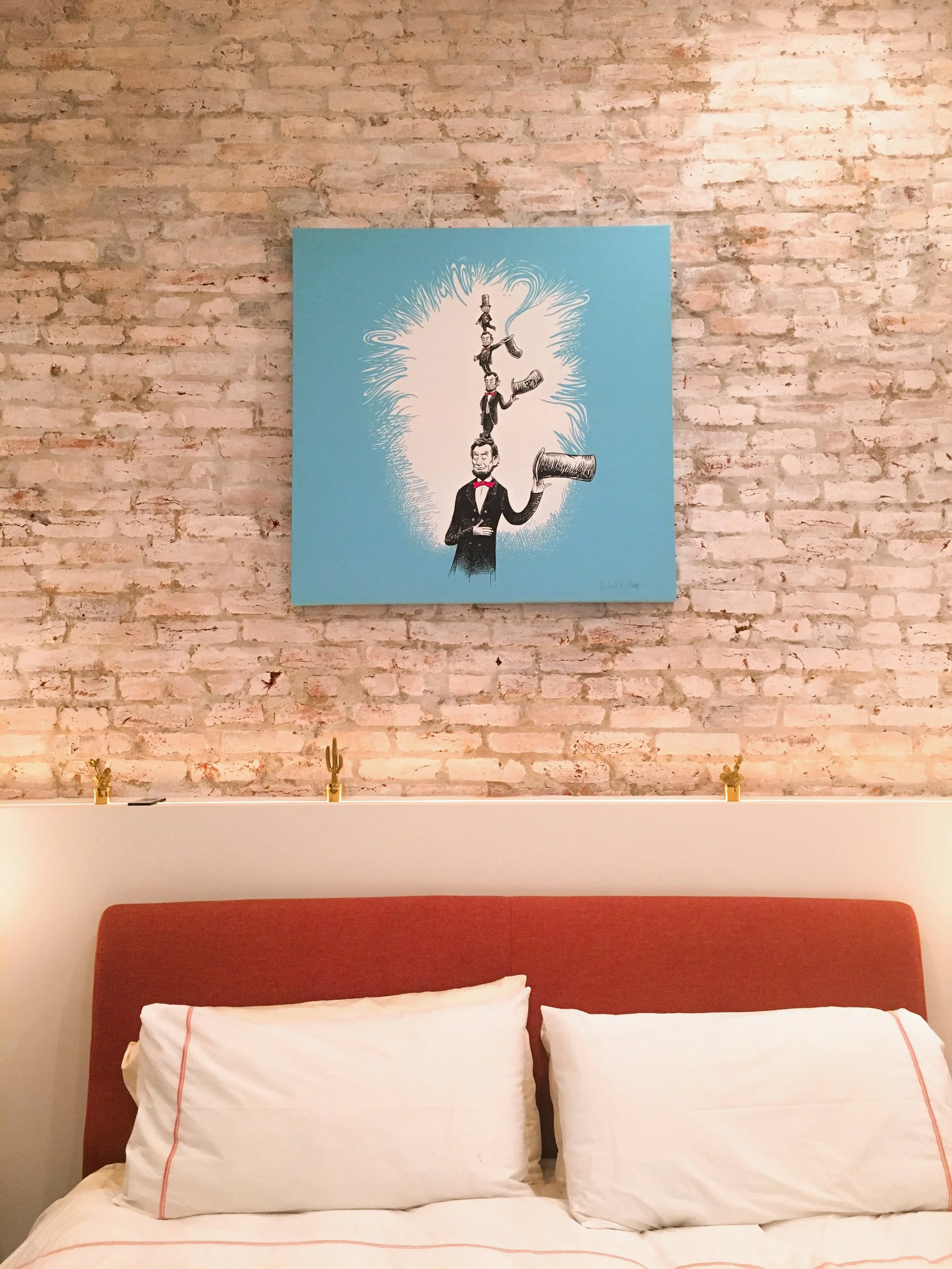 Later, we pulled into our rented SpotHero parking space in DC for the weekend (only $25 for 3 days!). We walked the few city blocks to our Airbnb in the historic Eckington neighborhood, just in time for dinner. Let’s set the scene, shall we? For any of you who have seen House of Cards, the opening credit sequence boasts Eckington’s personality: Colorful rowhouses in a palette of pink, gray, yellow, mint green, slate and blue. Canopies of old elms and tiny front yards line the family-friendly neighborhoods – Eckington really reminded me of our beloved Wicker Park neighborhood in Chicago! We found the lockbox to our Airbnb which, after breezing through the slate gray front door, I was seriously struck by a few things. First, that red mid-century modern couch and shag rug in front of a glossy white enameled fireplace. And secondly, the exposed brick wall lined with framed quirky prints of recent presidents like Obama, perched on top of a lion and wielding a light saber. Simply put: this Airbnb was perfection and set the tone for our presidential themed weekend in the nation’s capital.