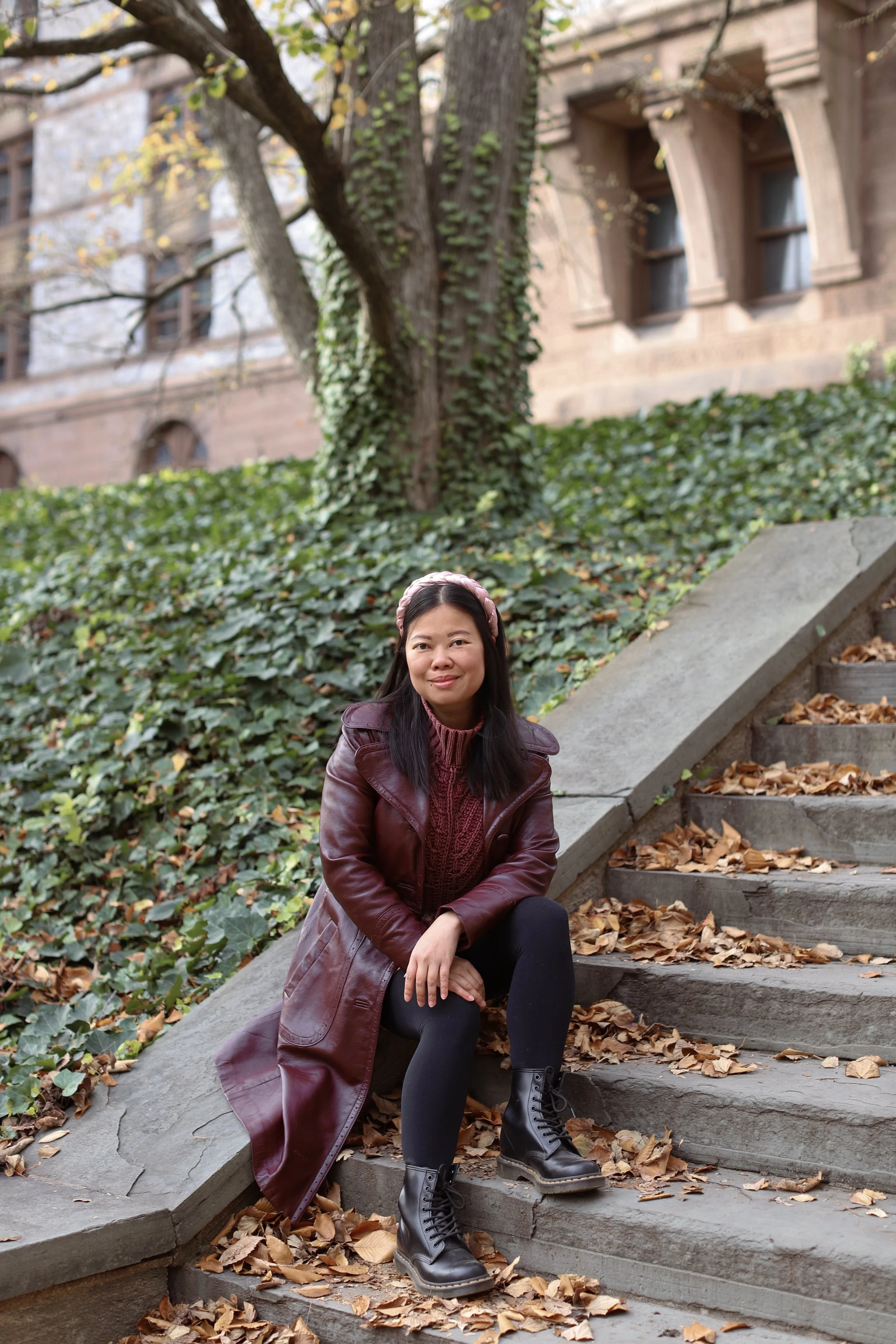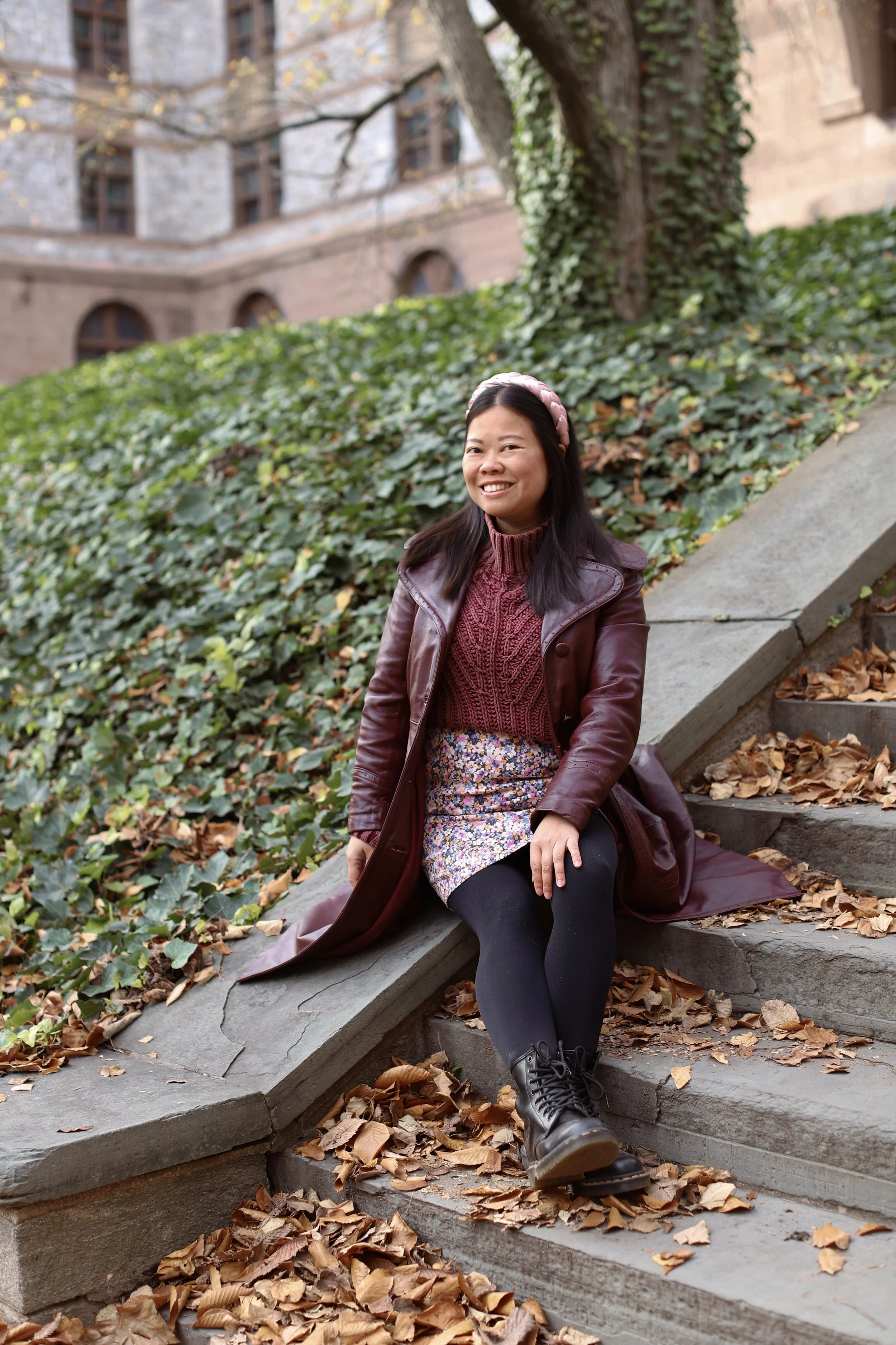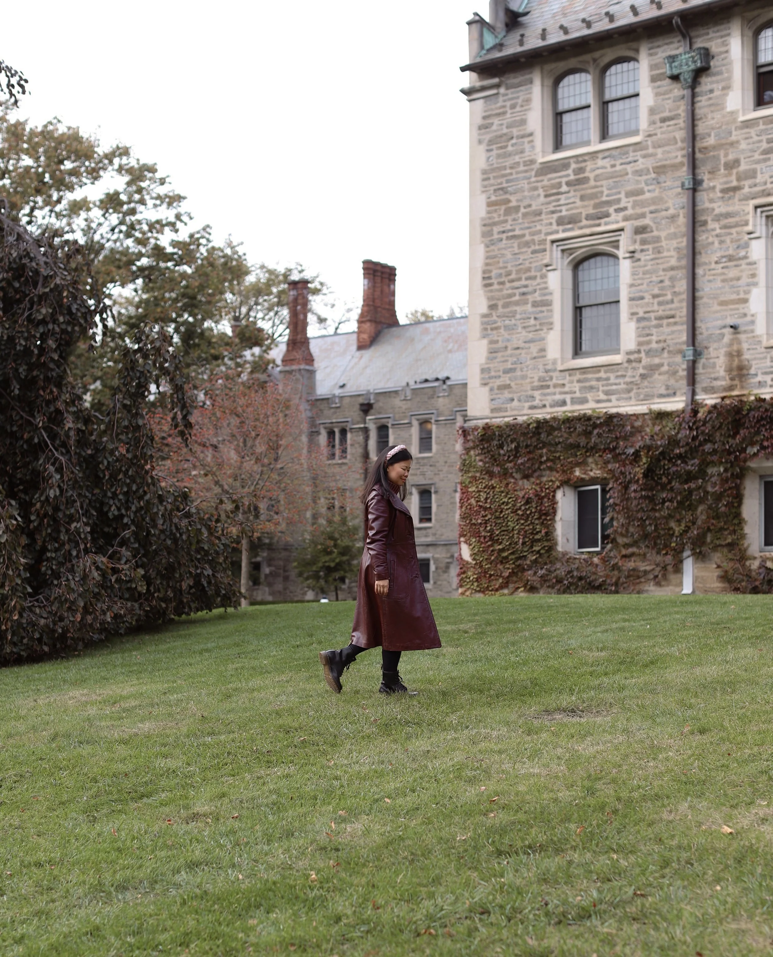 Wearing vintage leather trench coat, FreePeople knit sweater, Wild Fable skirt from Target, and Doc Martens.