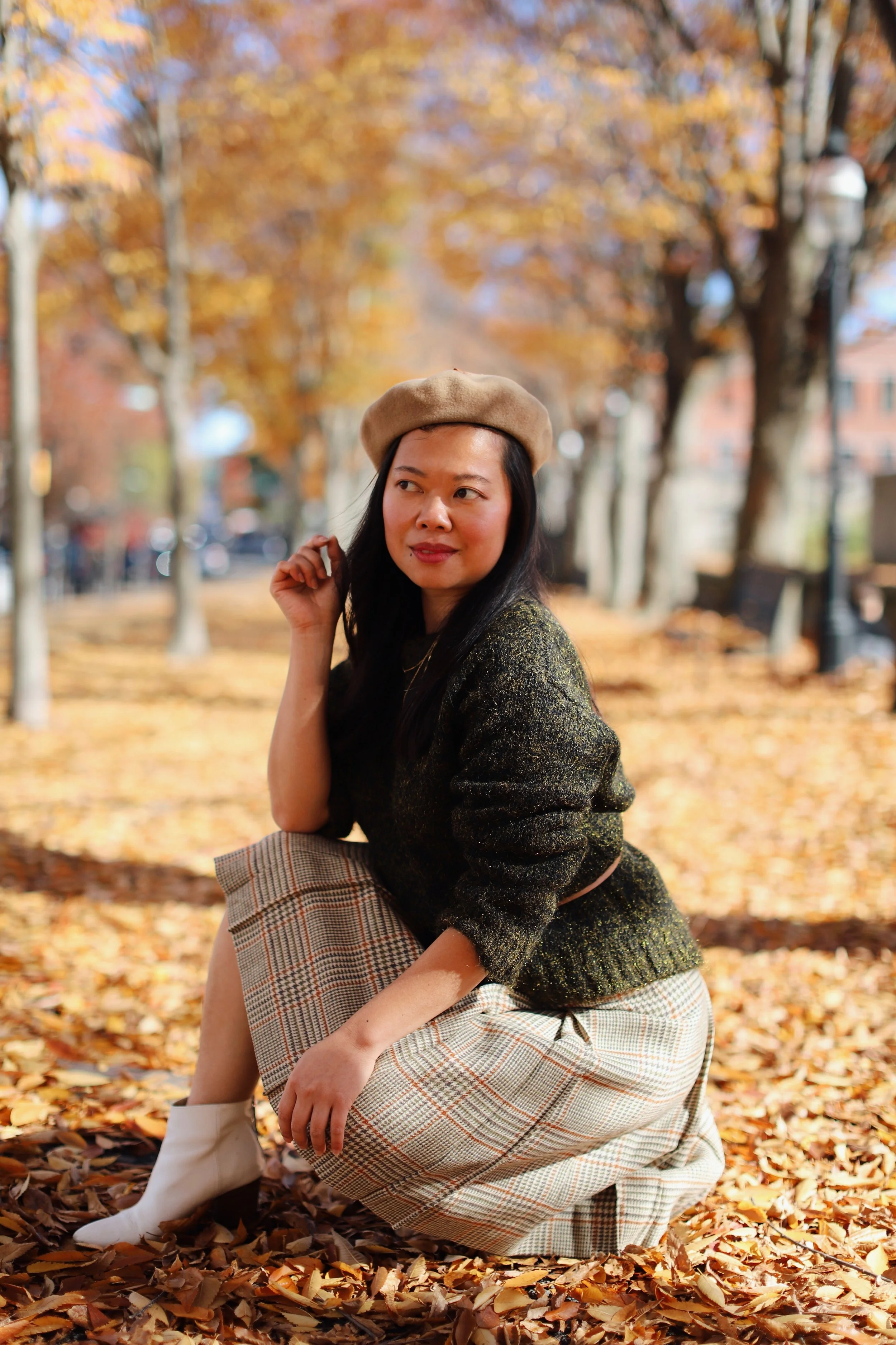 Celebrating the last bits of fall before it’s officially coat season with a frolic through the foliage. When you think of fall style, it’s usually all about the pumpkin spice latte and warm rust colors, but I think this green Geysir wool sweater I got in Iceland a few years ago is pretty fall-perfect. When paired with warm caramel hues and plaid prints, it makes for a dreamy fall color story. Normally I reserve this wool sweater for winter because it screams holiday style, but I had fun trying something new and styling it up for fall this year. How did I do? It’s woven with flecks of metallic gold thread, and this green is the exact shade of Icelandic moss flickering like gold in the Scandi sunlight.