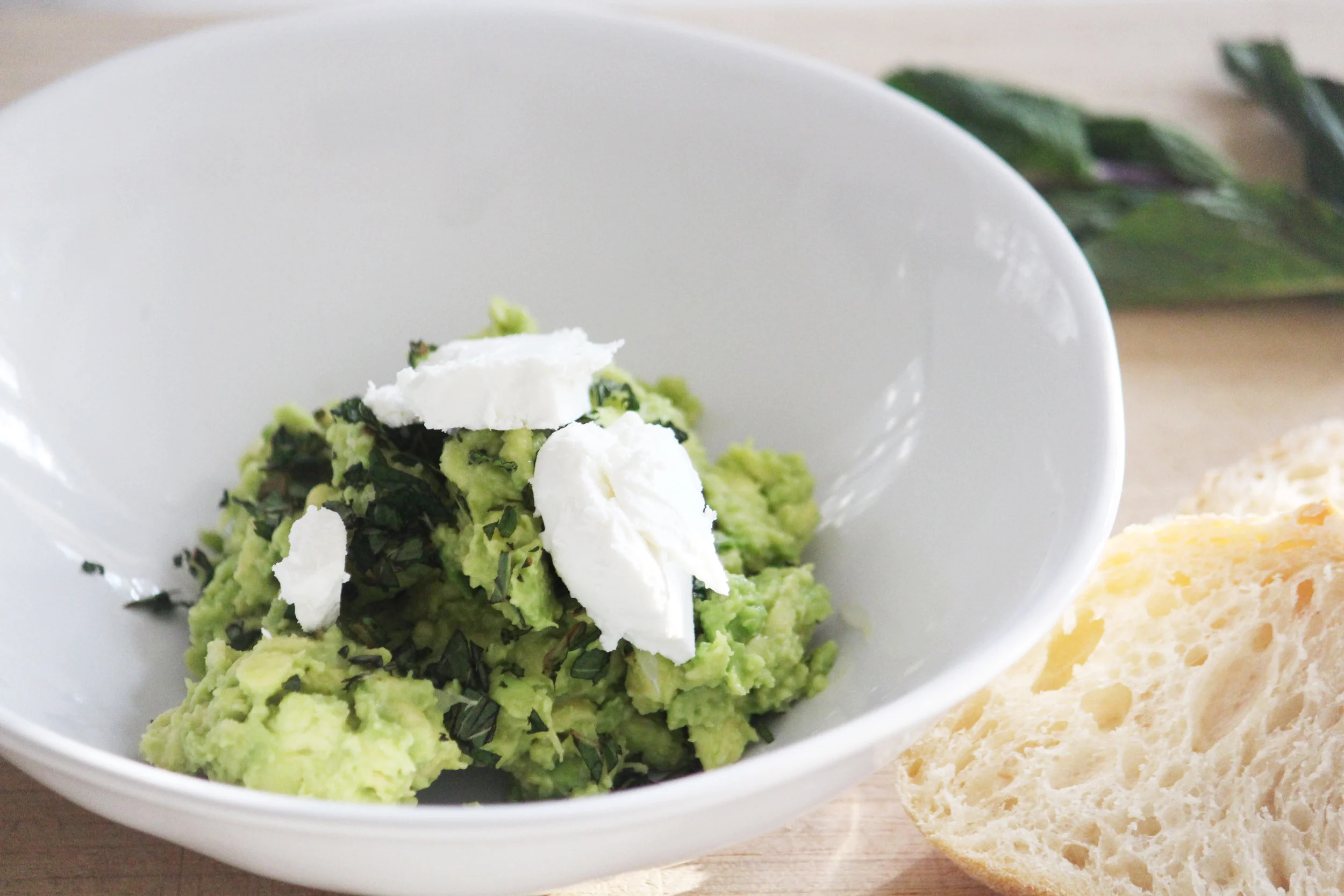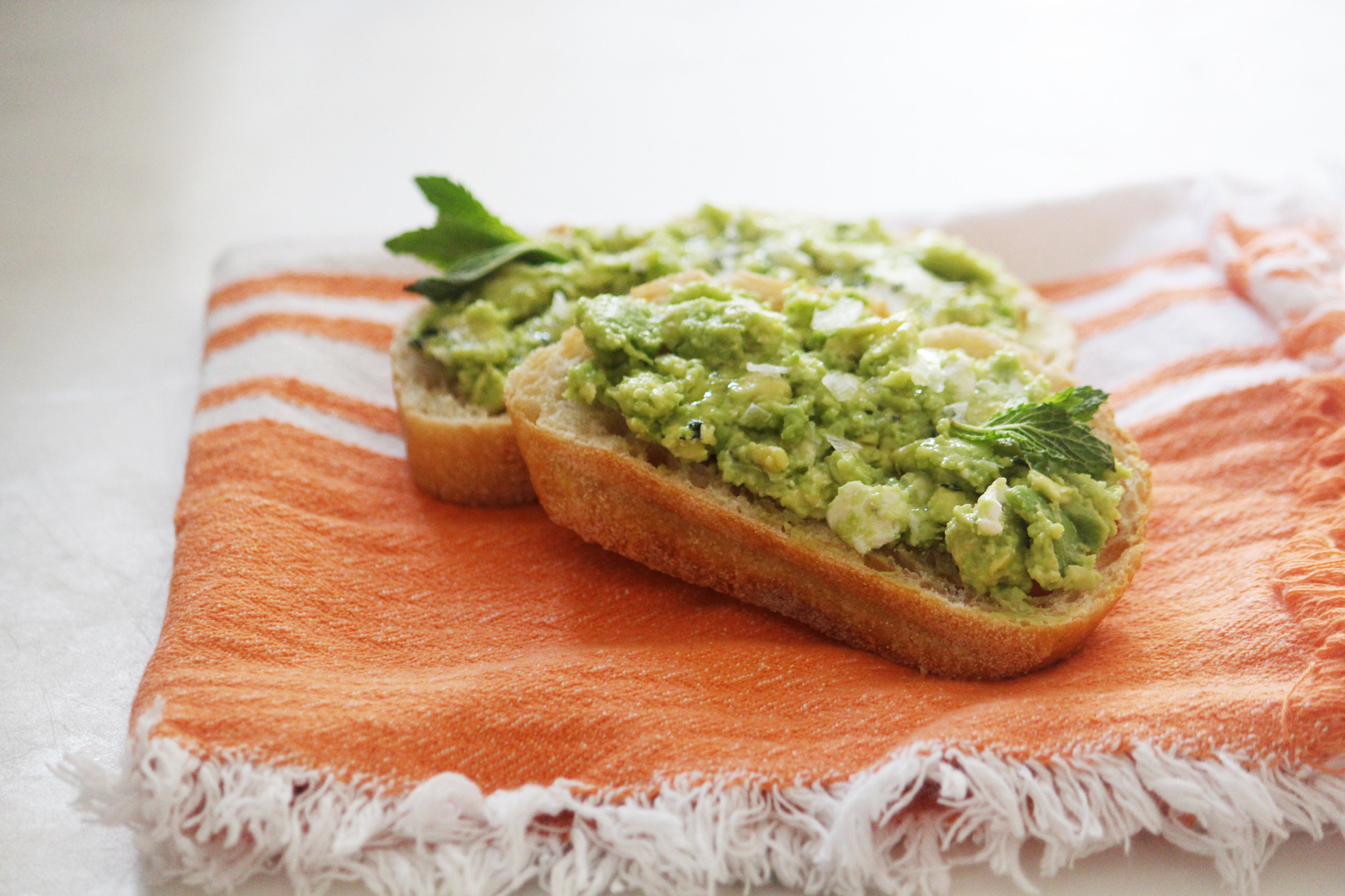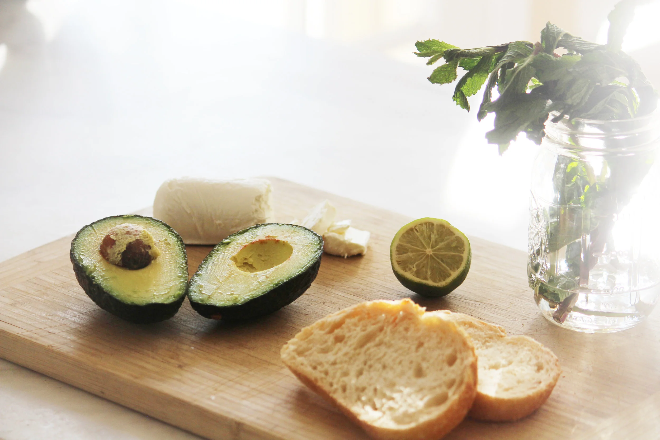 Lightly toast your bread. Halve, pit, and scoop out your avocado with a spoon. Mash with a fork and mix in the lime juice and mint. Crumble the cheese and fold it gently into the avocado mixture, leaving some small chunks.