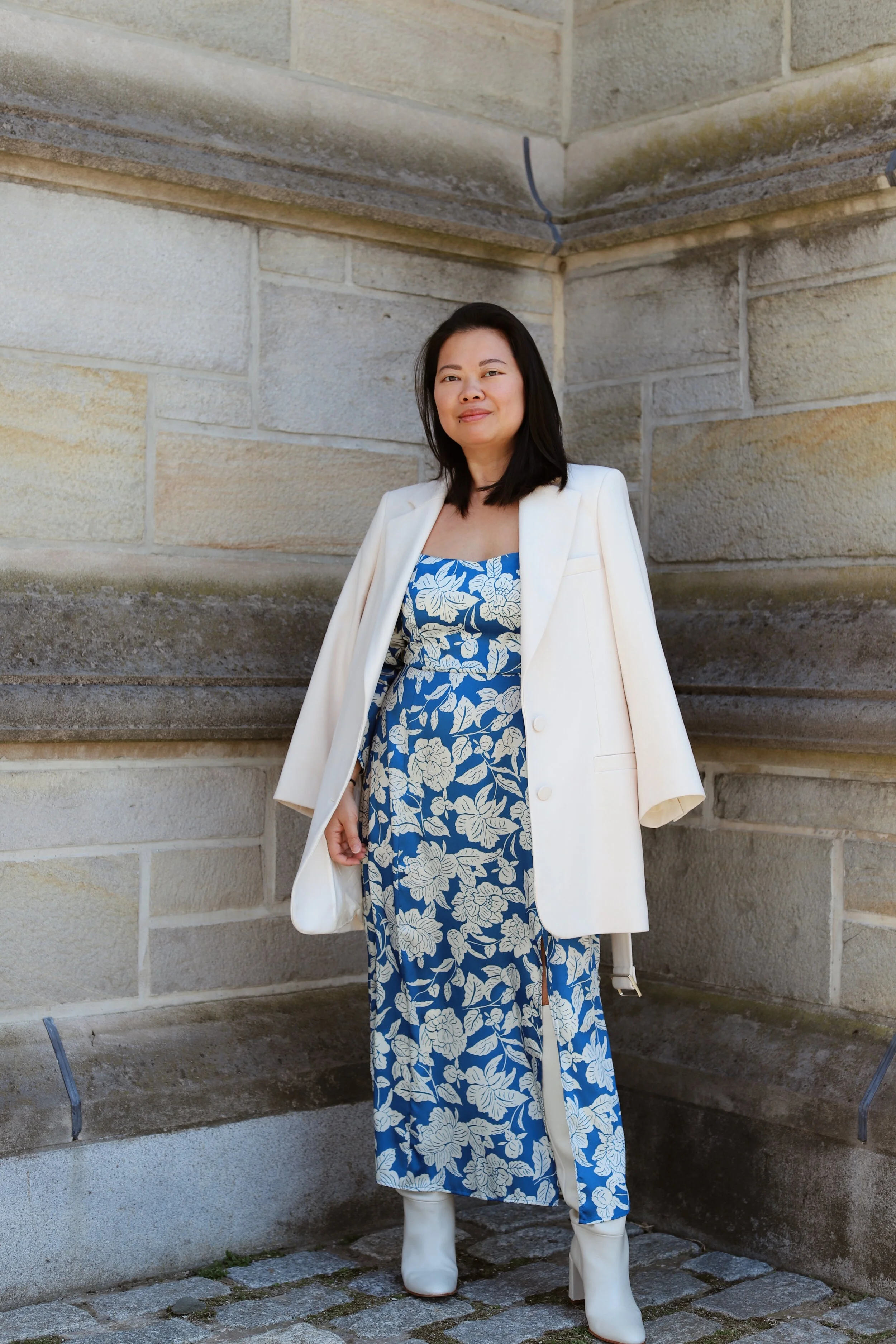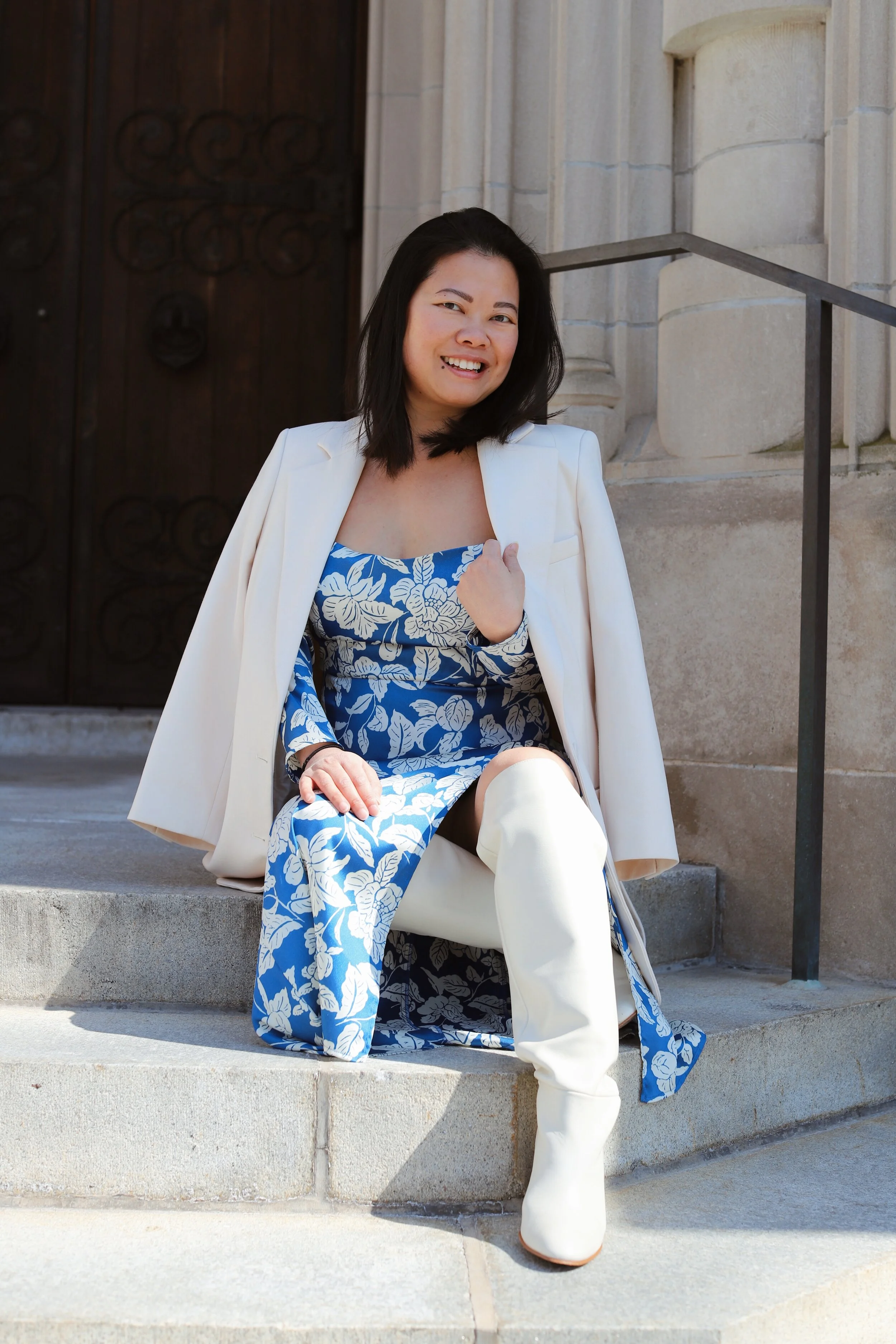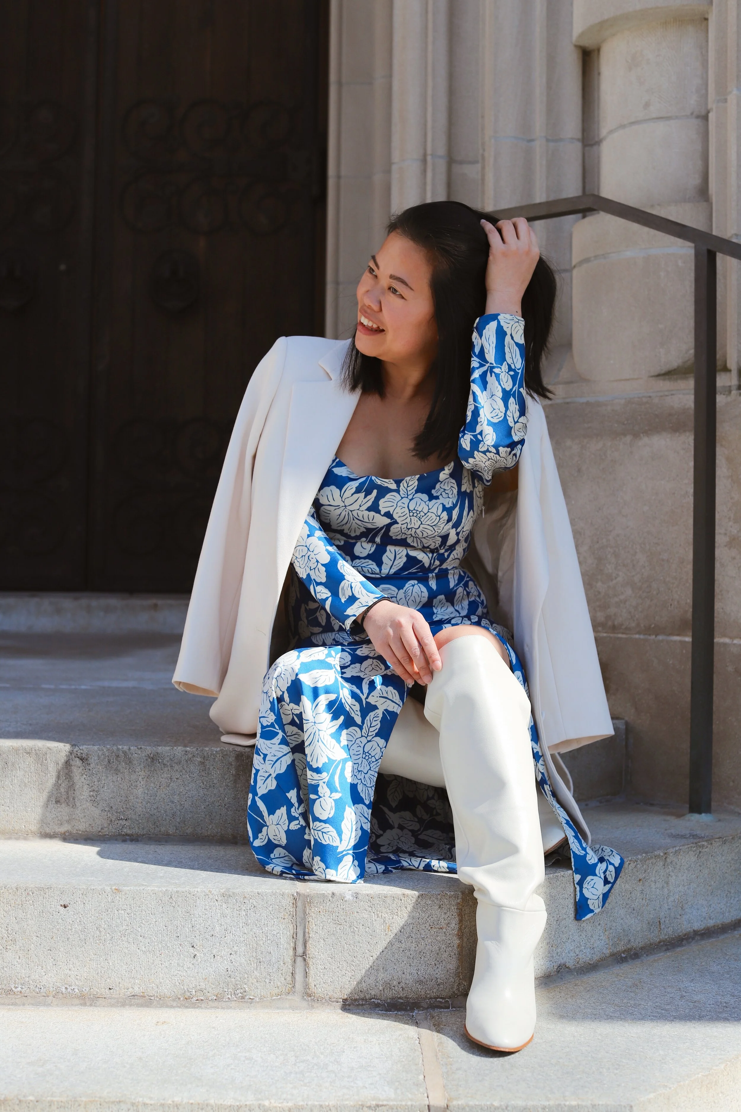 Wearing floral maxi dress from Zara, white blazer (old) from Zara, white knee-high boots from Zara