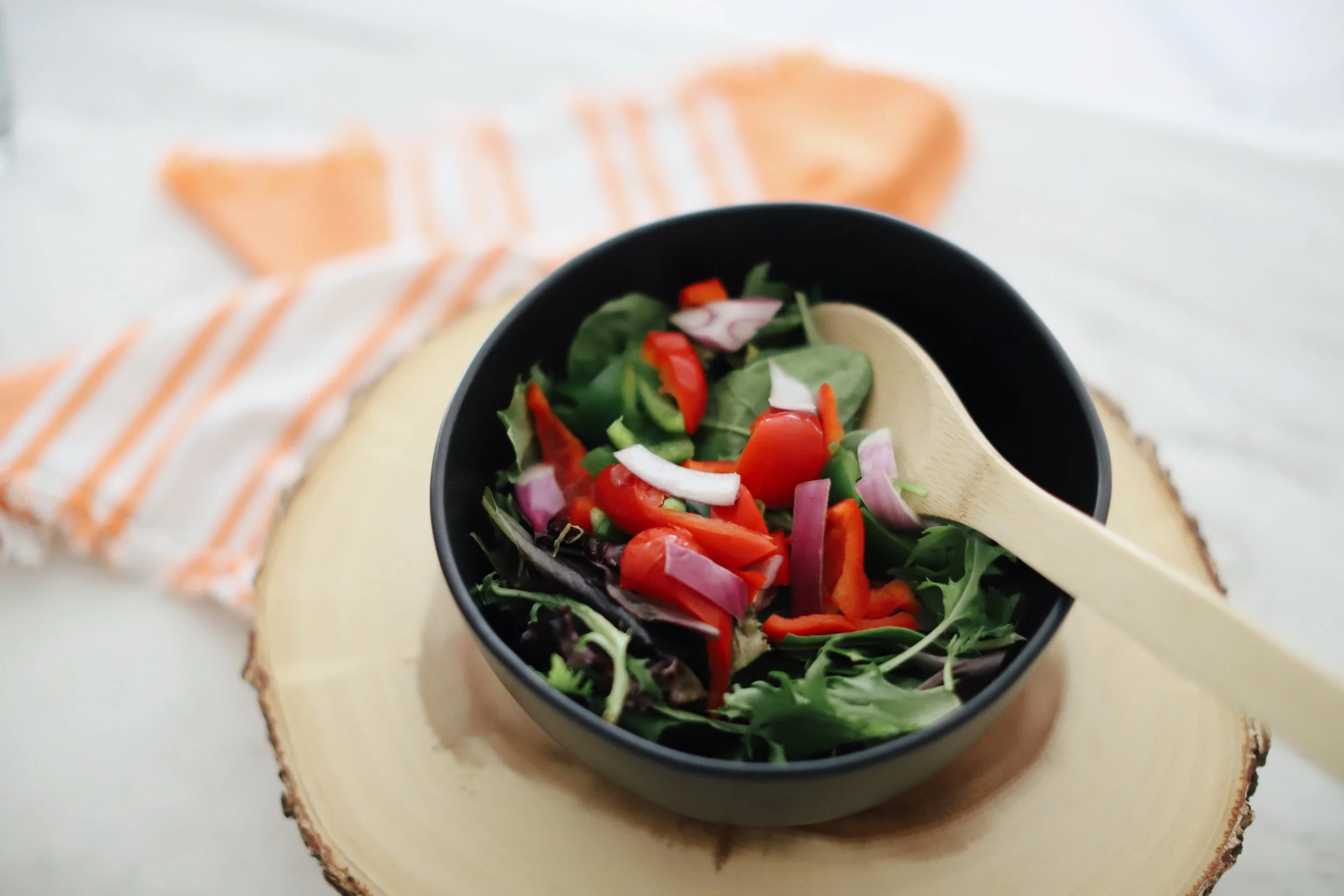 Wholesome Pantry Spring Mix Salad tossed with roasted bell peppers, red onions, and a homemade lime-honey vinaigrette