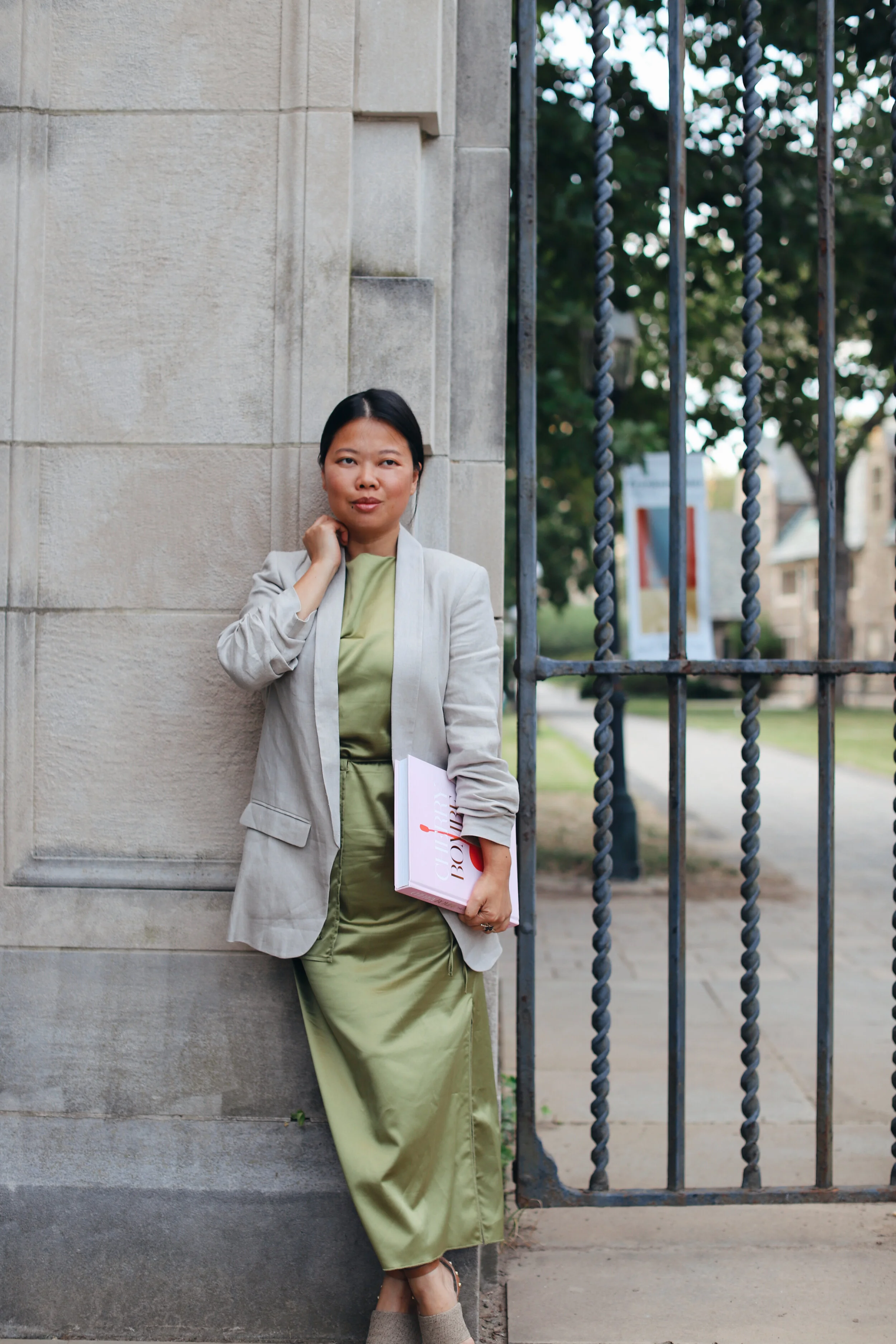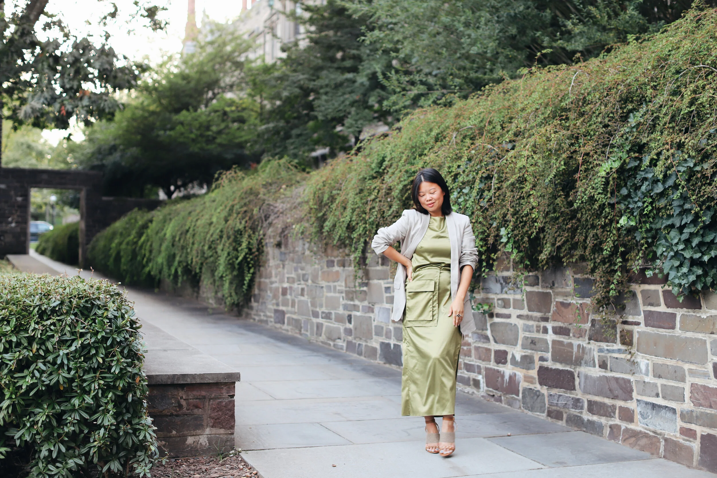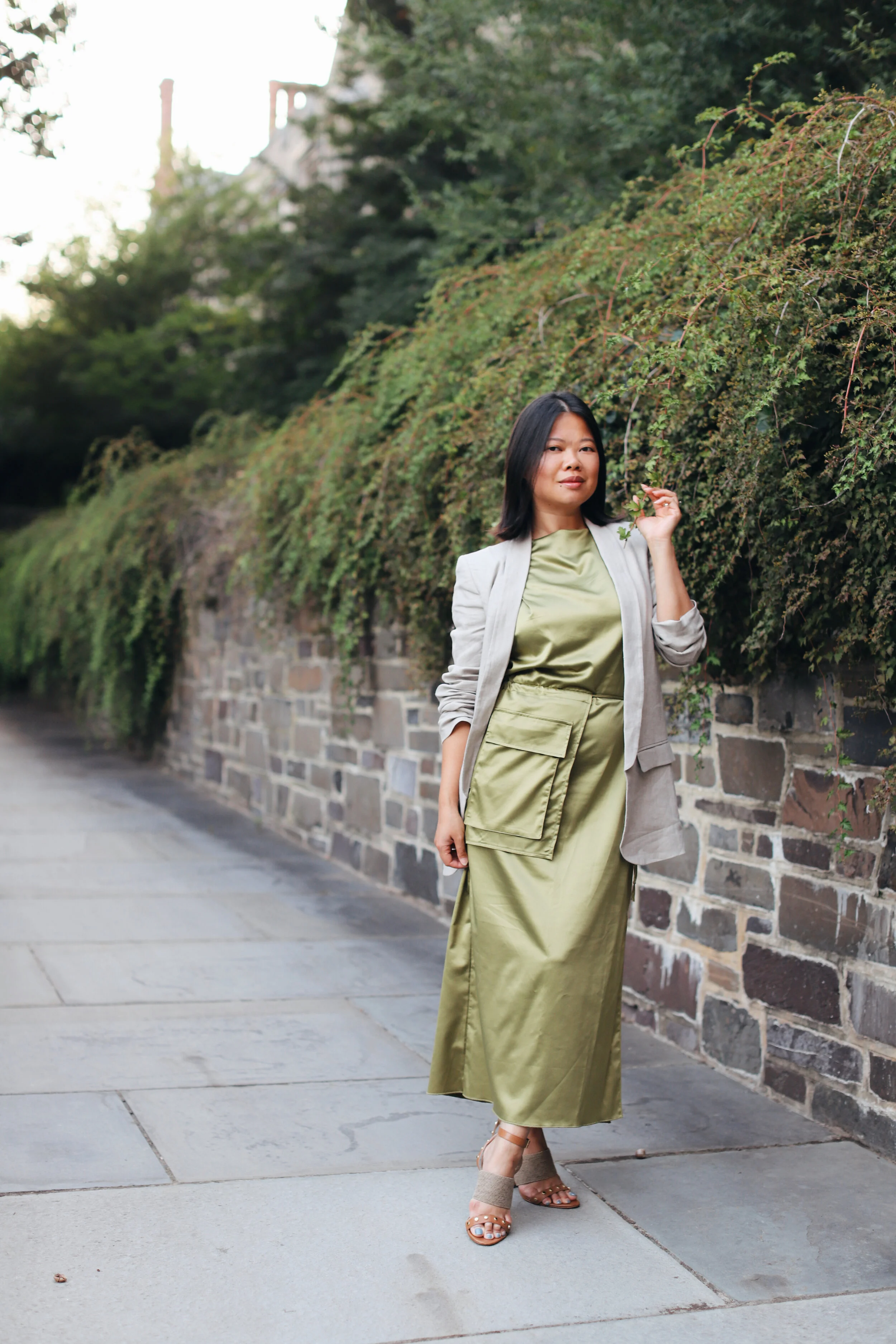 Wearing Zara linen blazer, Zara green utility dress, and Kinraden TO THE LAND ring.