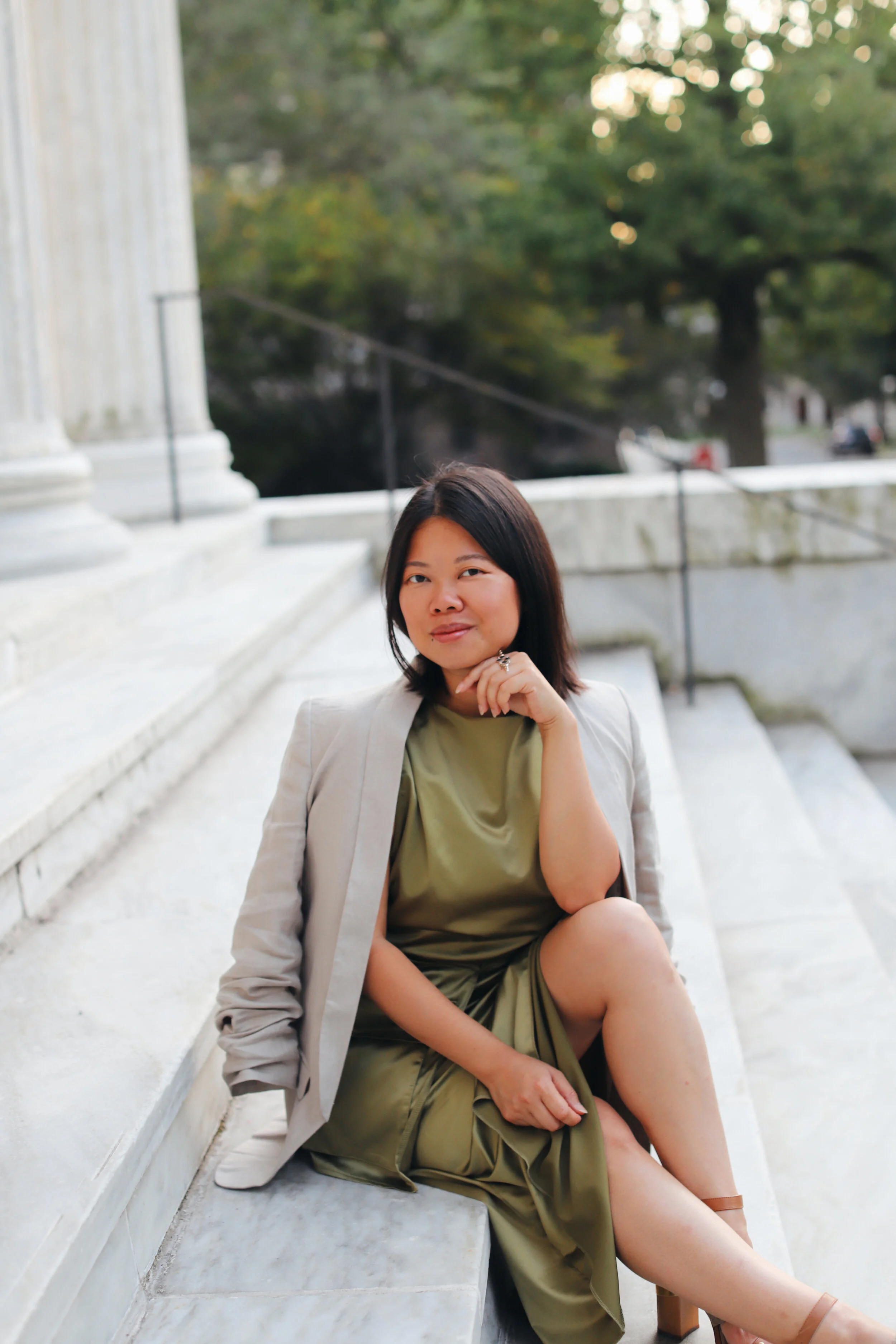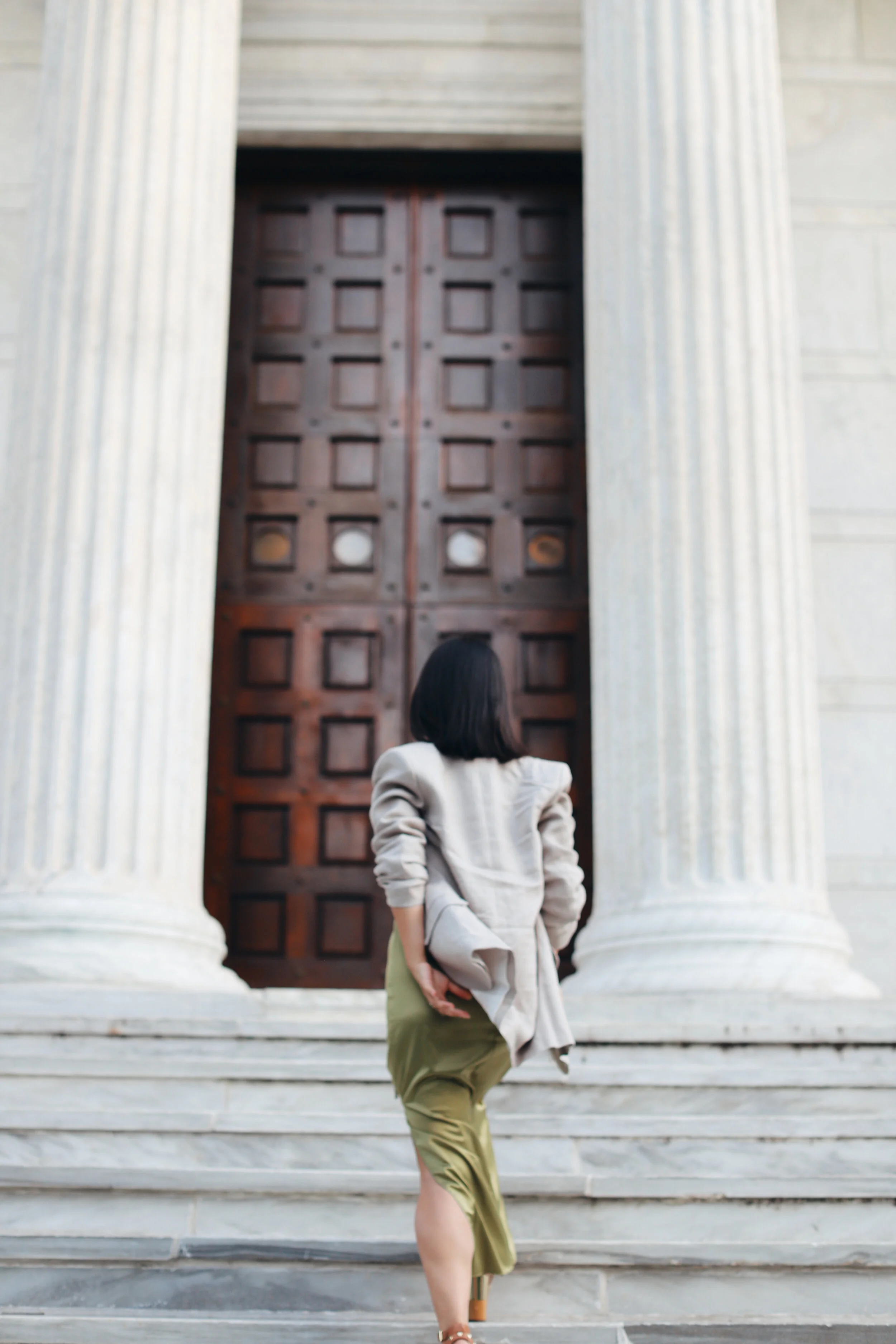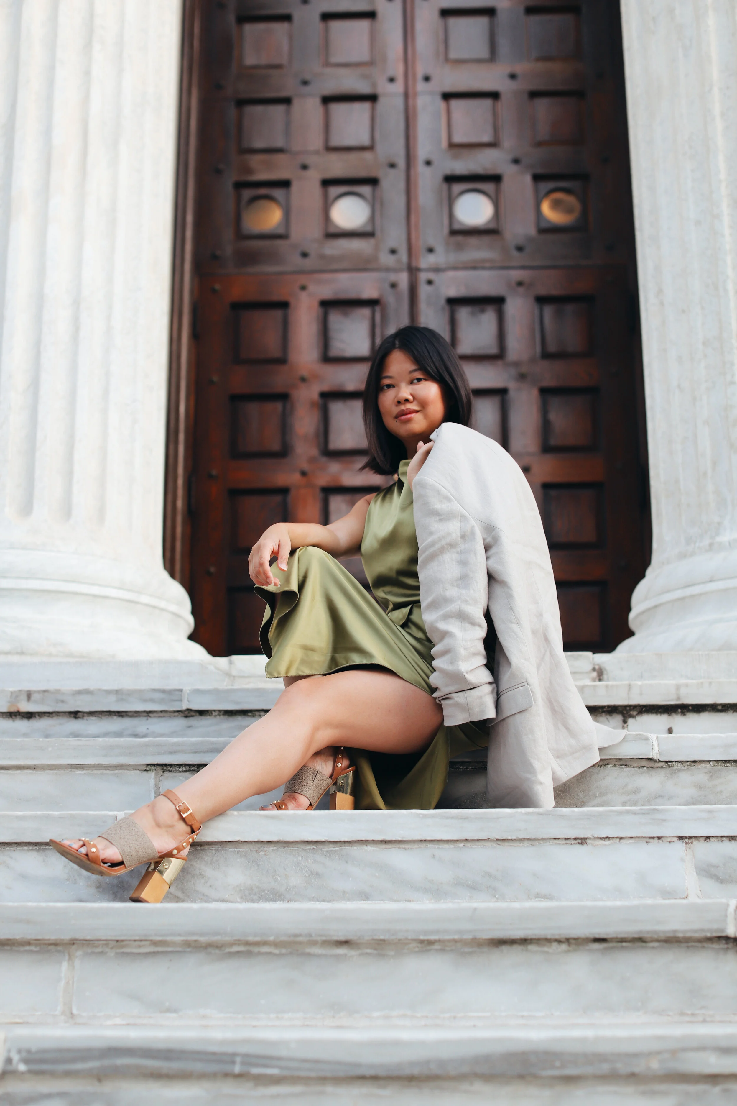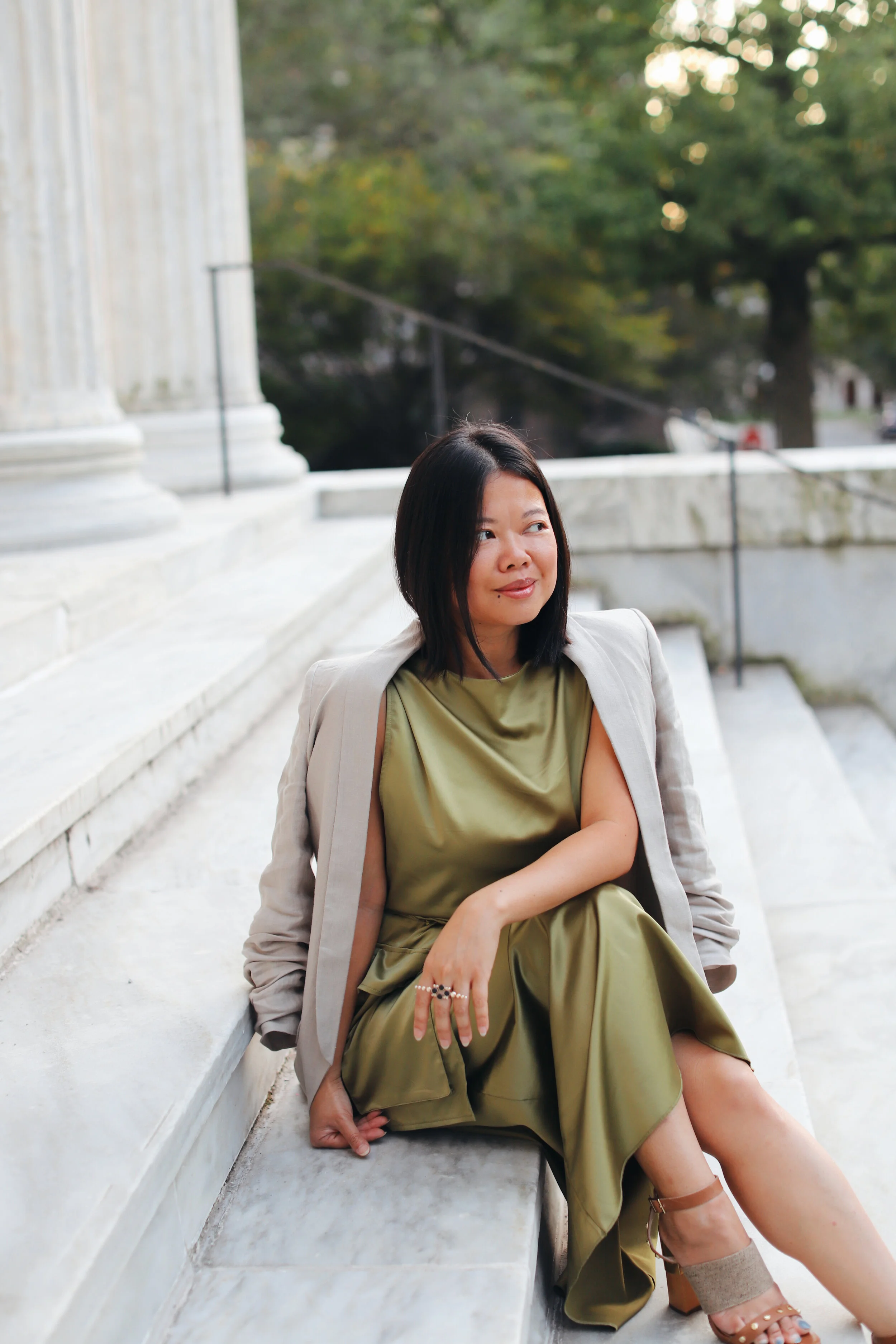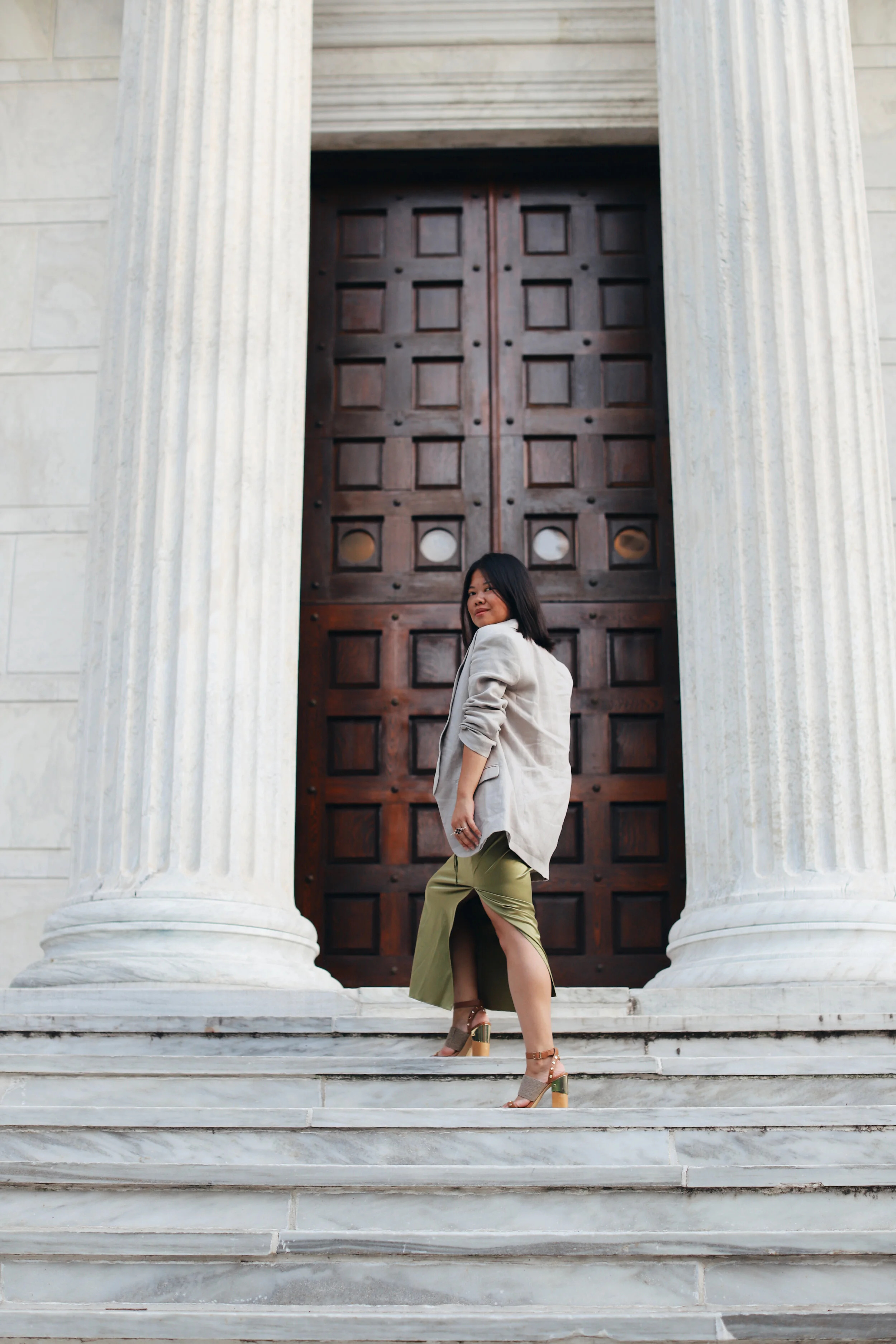 As with the start of any new season, I love organizing our seasonal closets and am knee-deep in putting away all the summer dresses and swimsuits (never mind that we have a sudden spell of mid 80 degree temps this week). Back when I worked in a corporate marketing environment, I collected my fair share of jackets and matching trousers. Recently, when my younger sis was visiting us, she had a video job interview with a prospective employer and asked if she could borrow a black jacket. To her dismay, I had to break the news that I don’t have even one basic blazer left in my closet—I mean, I haven’t had a corporate desk job in five years since I became a SAHM! As for this blazer I’m wearing here, when I myself realized I was sorely lacking a polished yet casual jacket – particularly one in the tan/cream/beige blazer department—I scoured the internet for one that could be dressed up or down. And with the resurgence of slip dresses (hello 90s!), I’ve been dipping my toe back in and love how versatile this neutral linen blazer + dress combo feels for daytime meetings that could easily turn into date night.