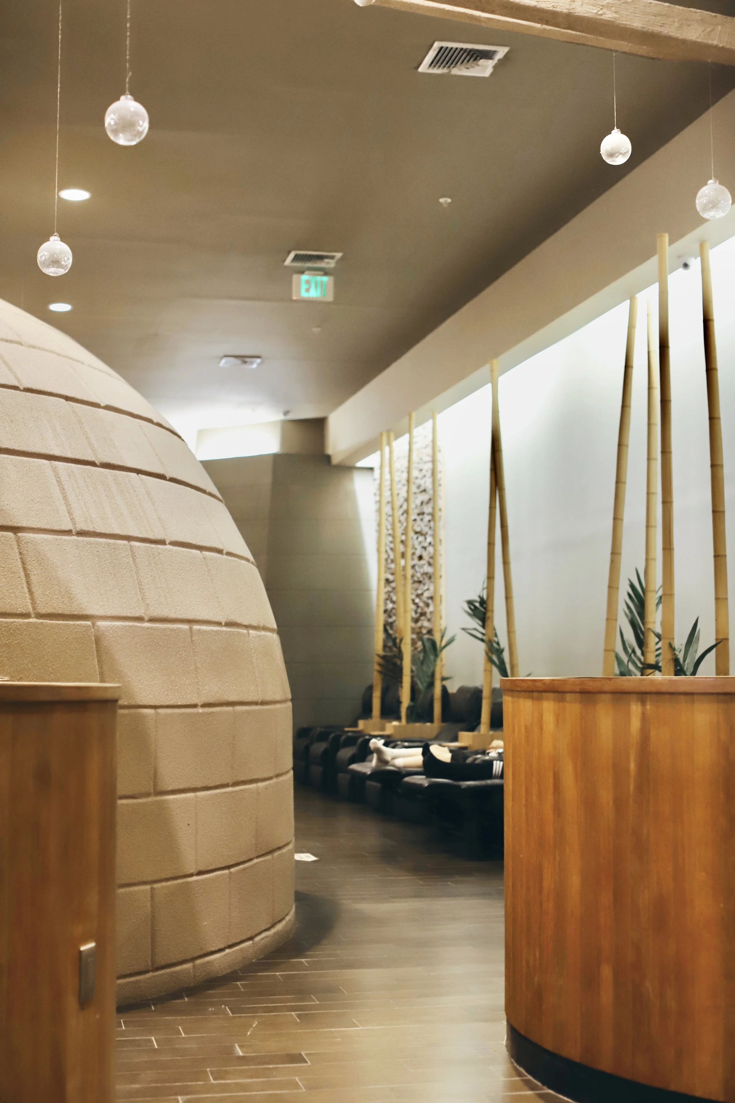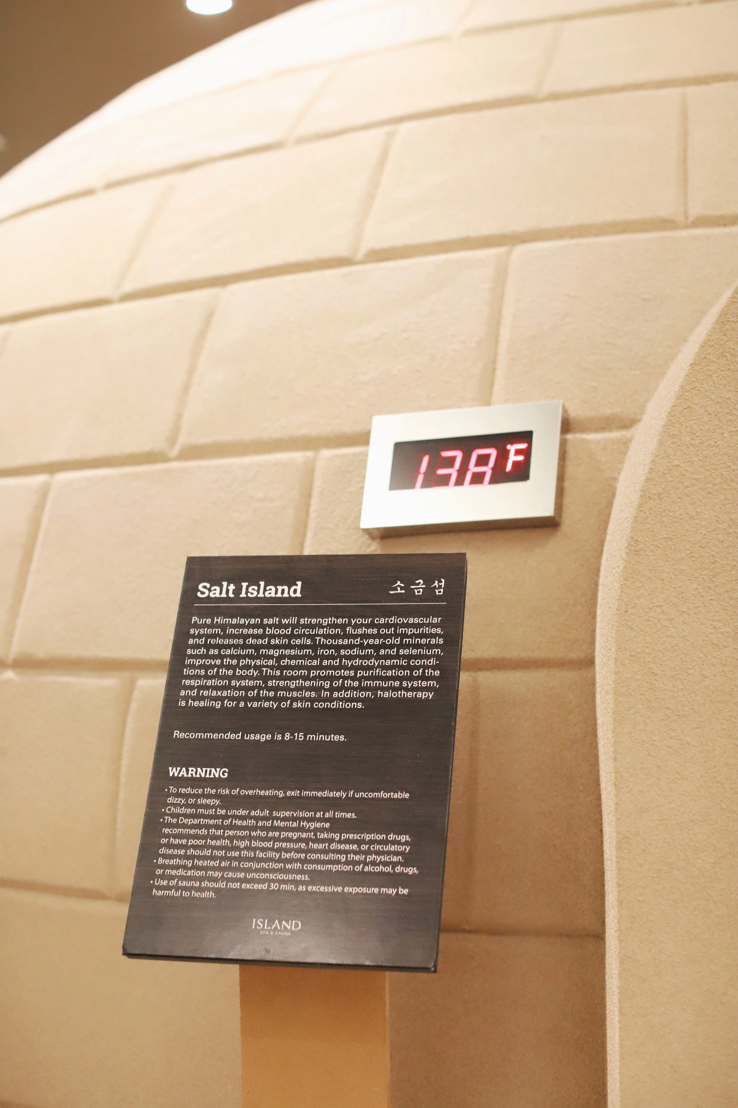 Now that you’re all relaxed from your soaking, put on your spa uniform and hit the dry saunas! Island Spa has 6 saunas, each with a special purpose. You can bounce between saunas as you please, but it’s common practice to stay no longer than 10-15 minutes in a room to risk overheating. Be sure to hydrate in between! I like to work my way through from least hot to hottest, and finish with Ice Island to close pores and tighten the skin. You’re welcome to stretch out on the jute rugs, make yourself comfortable, but be sure to follow spa etiquette and respectfully stay quiet.