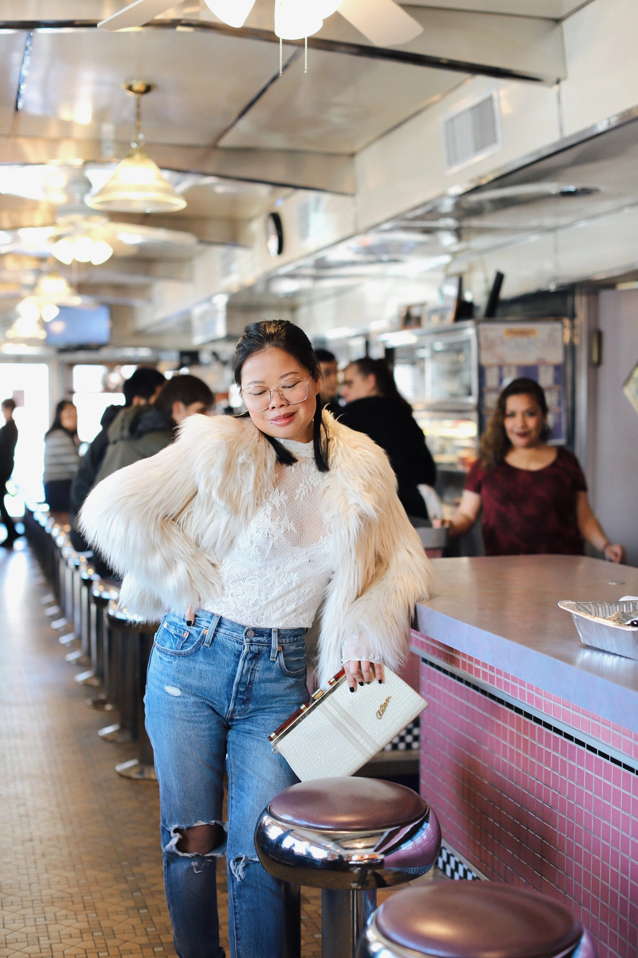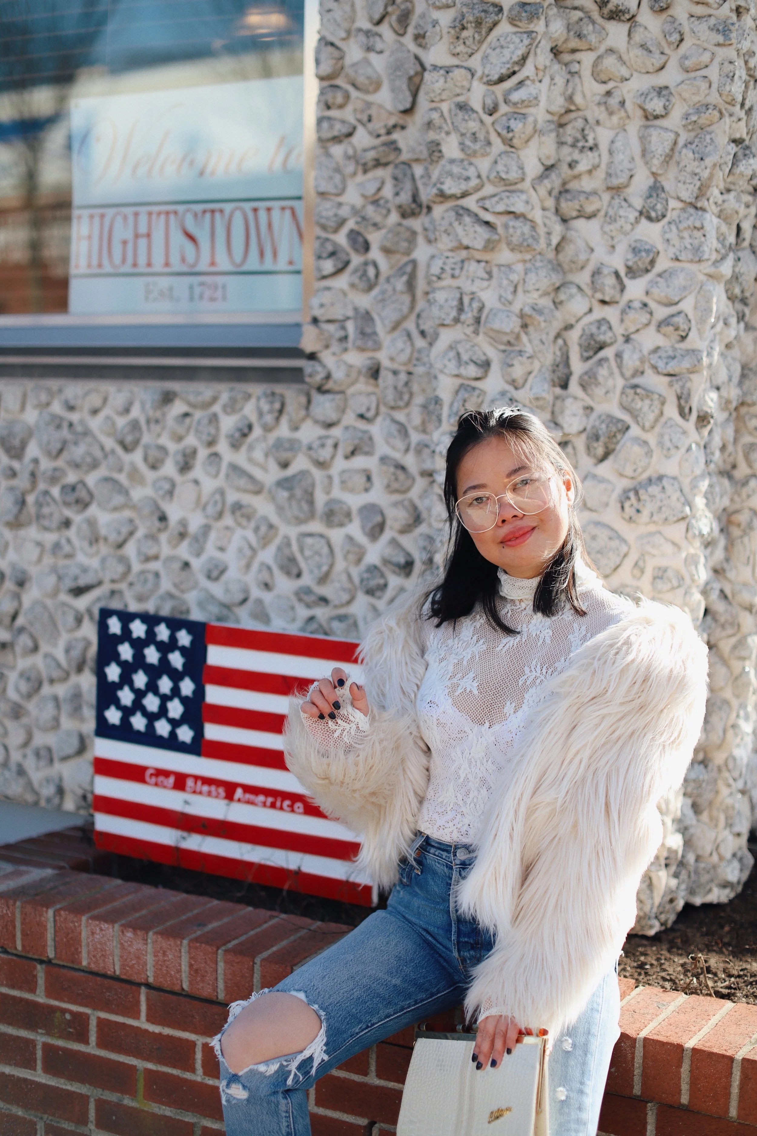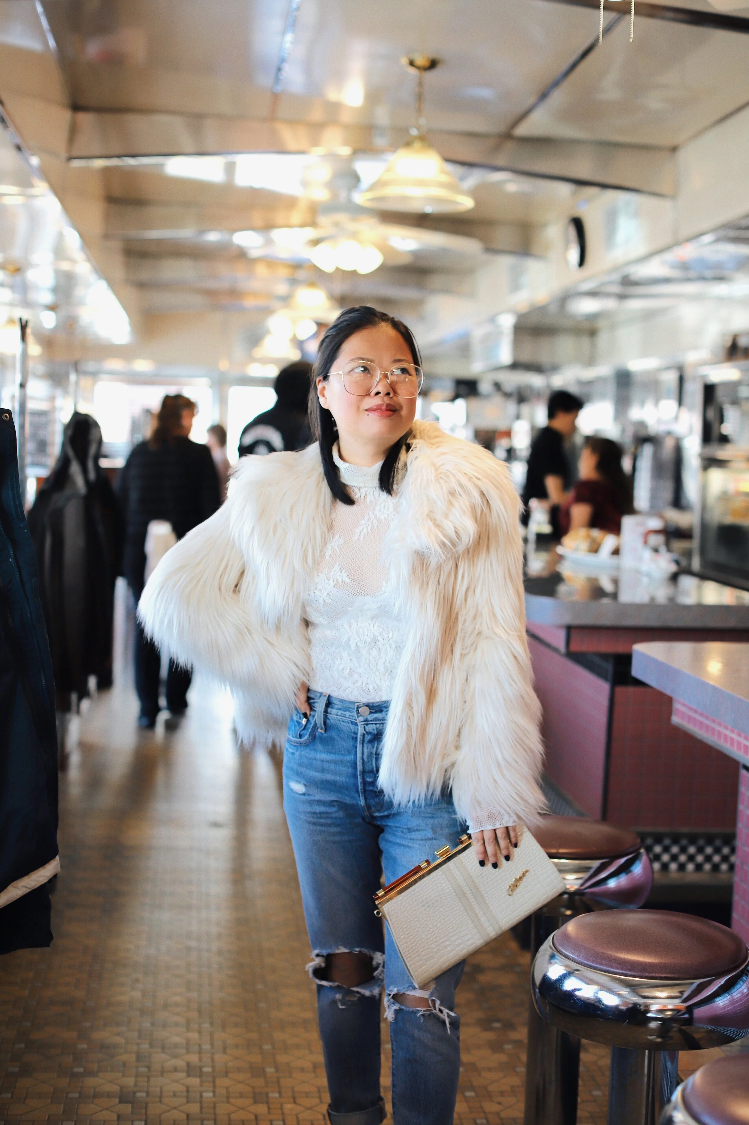 Wearing Vince Camuto faux fur jacket; FreePeople lace top (old, similar here); DKNY lace bodysuit via Amazon Fashion; Levi’s jeans (old, similar here); H&M glasses (old, similar here); vintage clutch from mom; vintage gold earrings from Second Chance in Hightstown, NJ