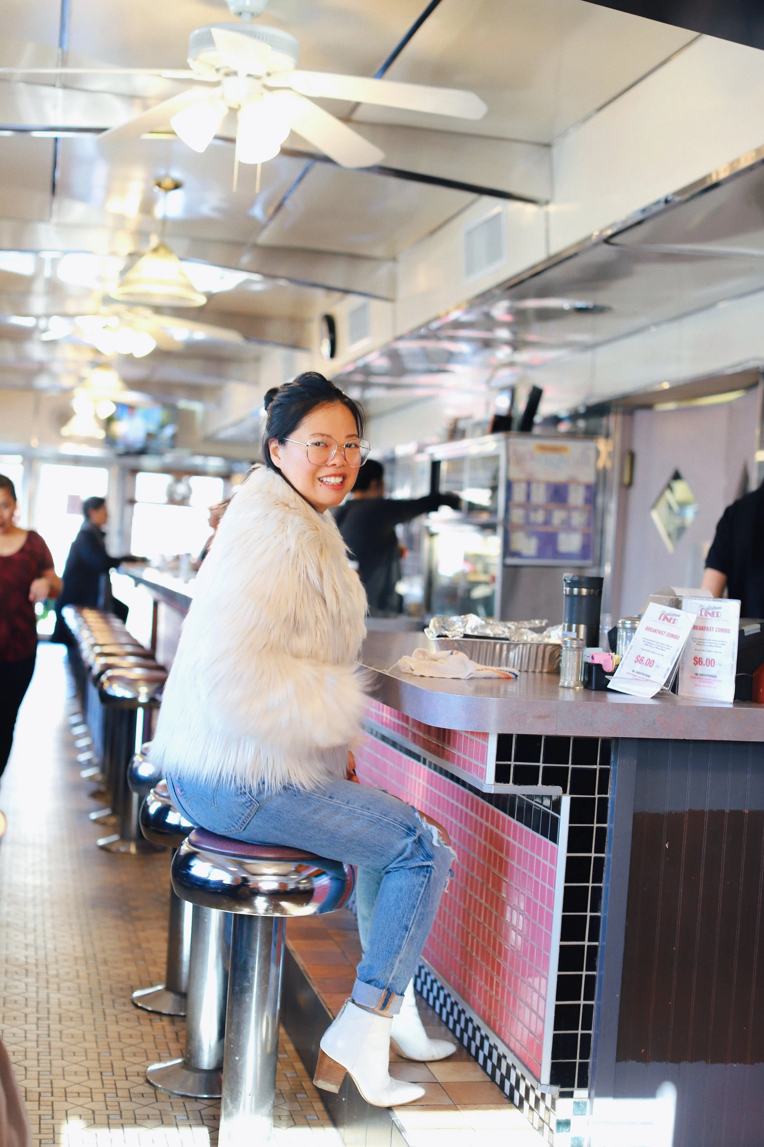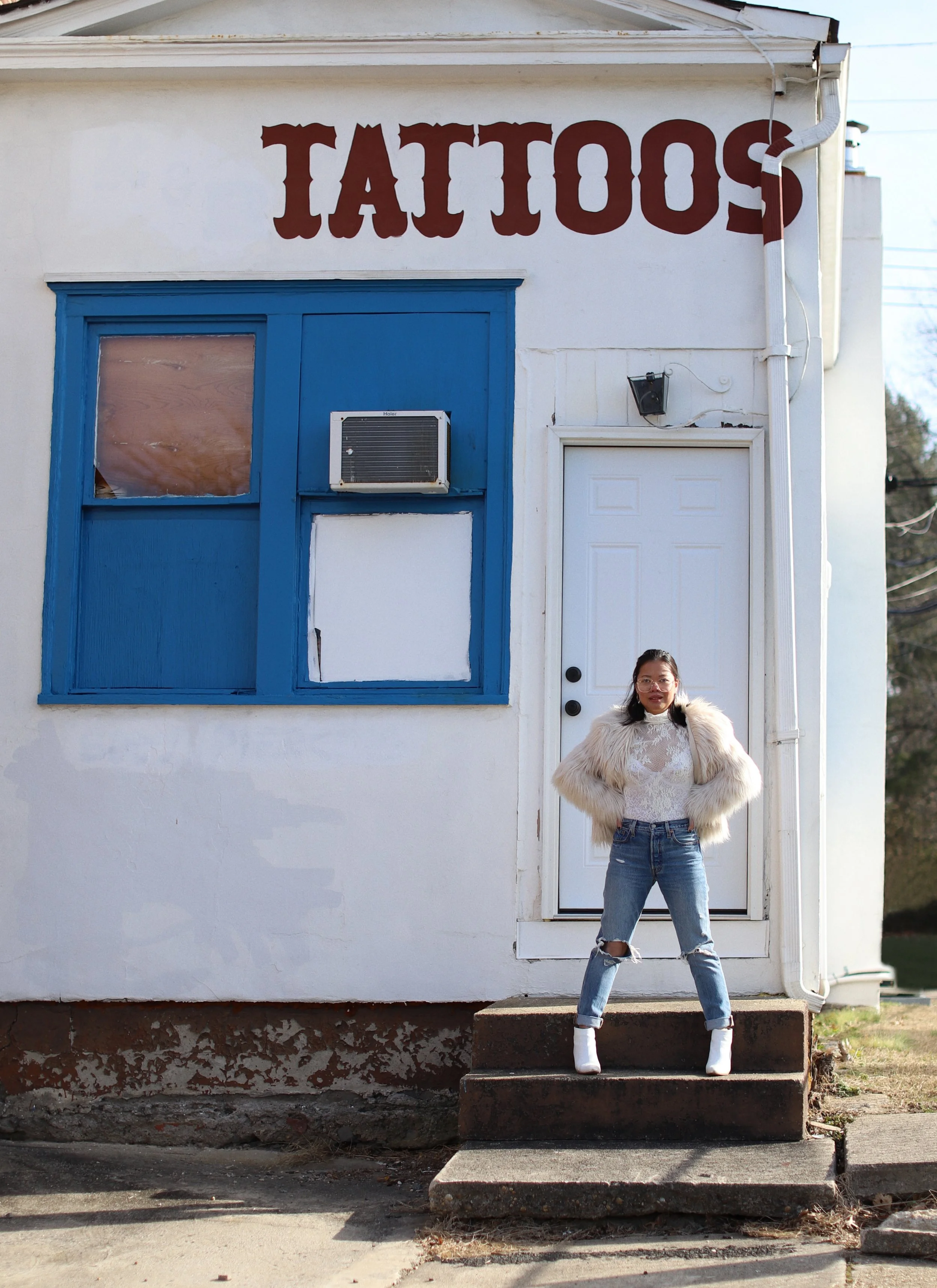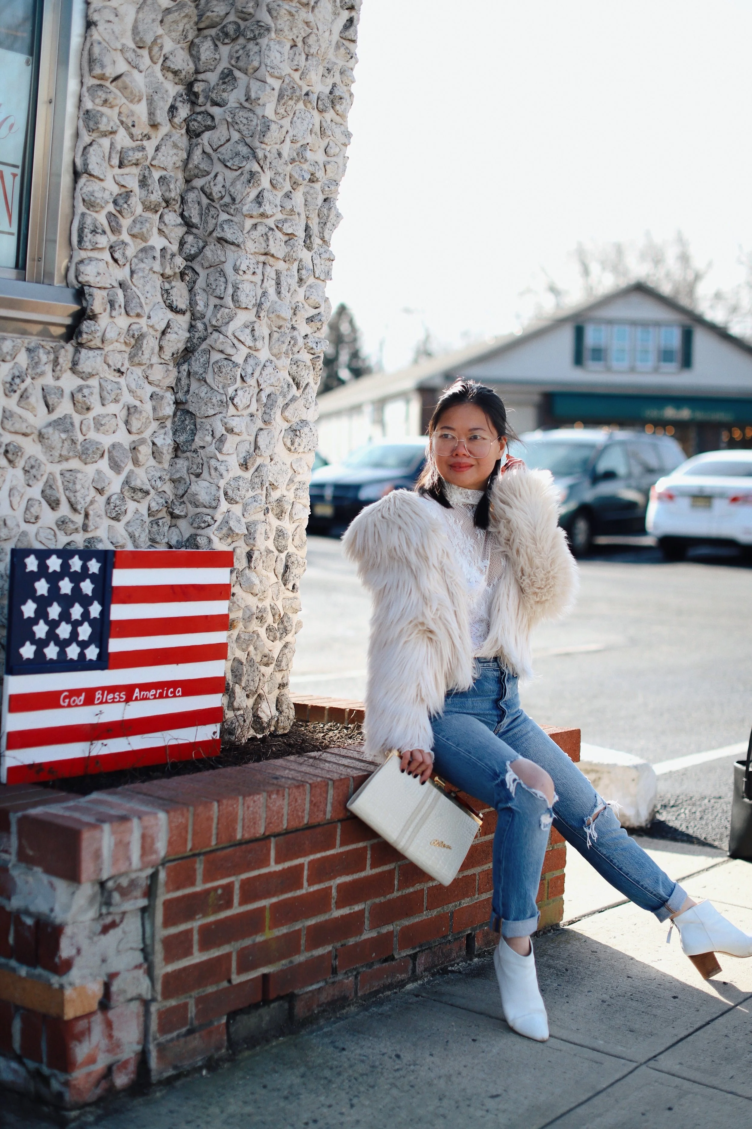 Wearing Vince Camuto faux fur jacket; FreePeople lace top (old, similar here); DKNY lace bodysuit via Amazon Fashion; Levi’s jeans (old, similar here); H&M glasses (old, similar here); vintage clutch from mom; vintage gold earrings from Second Chance in Hightstown, NJ