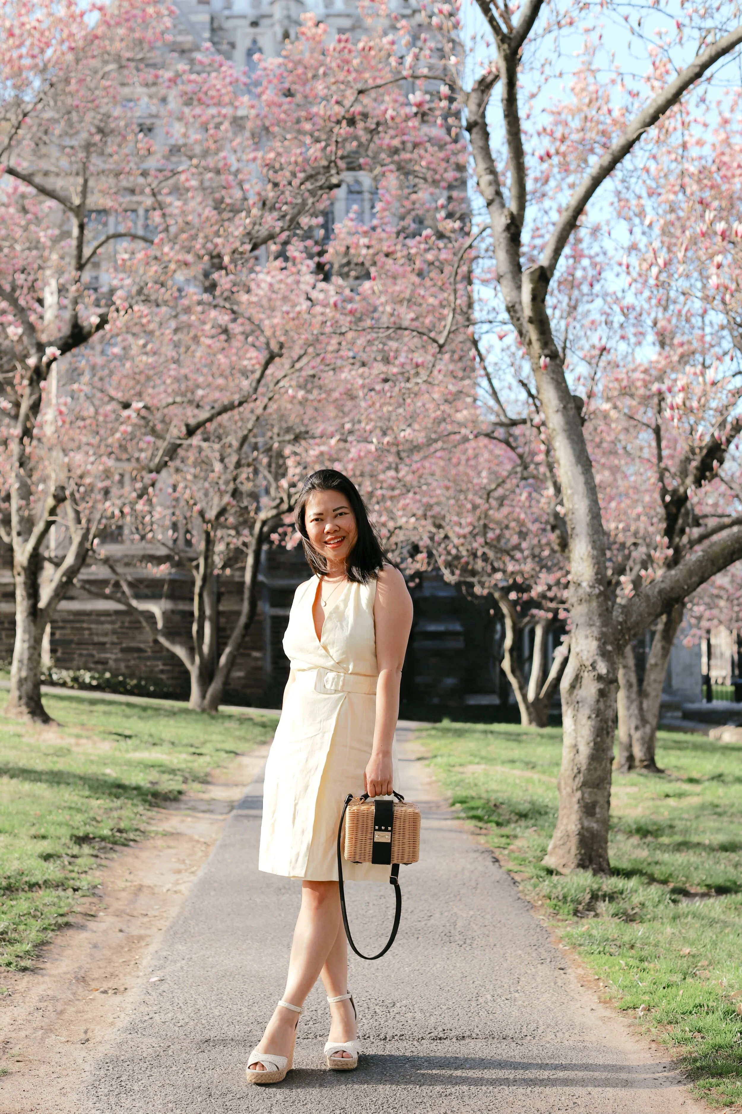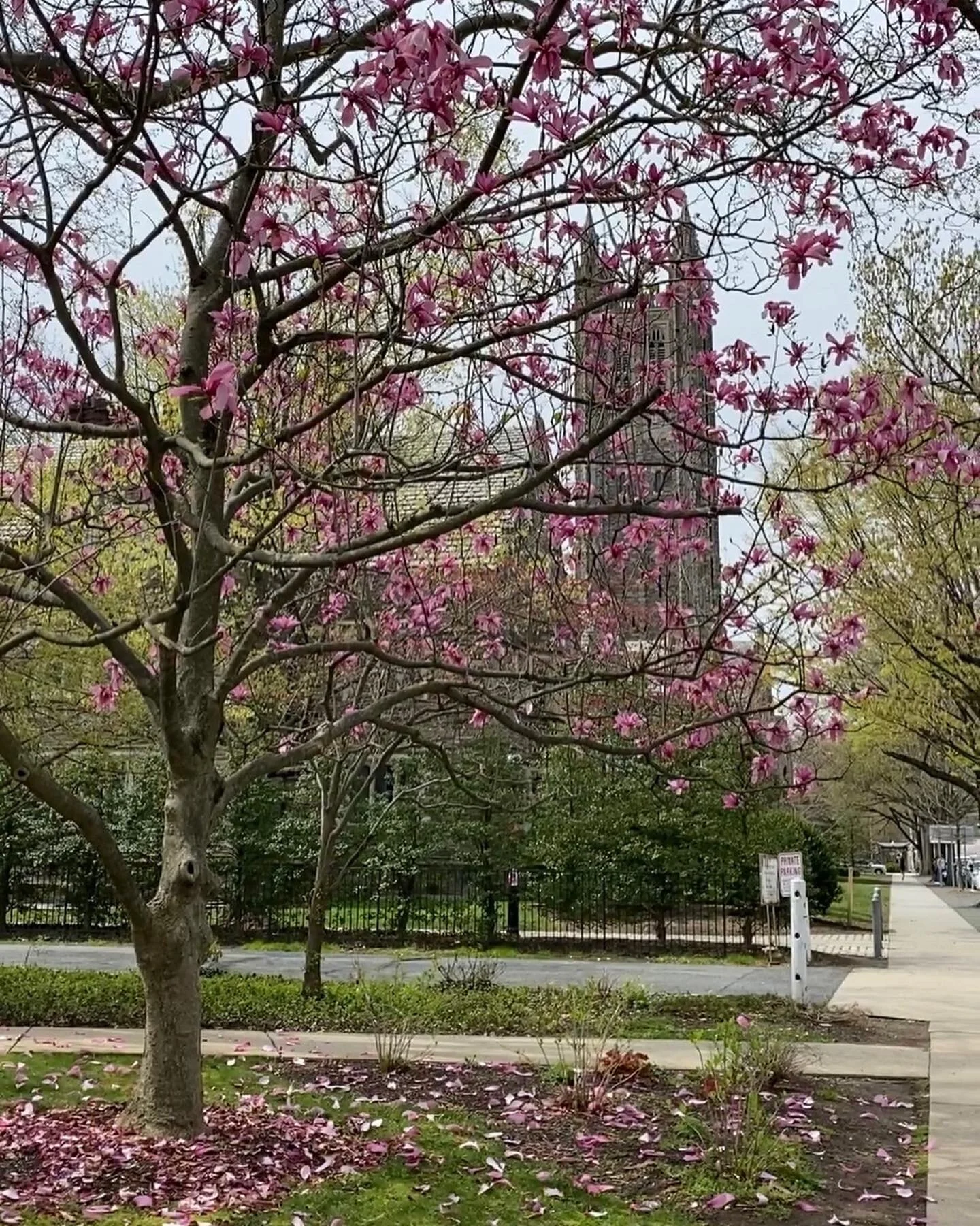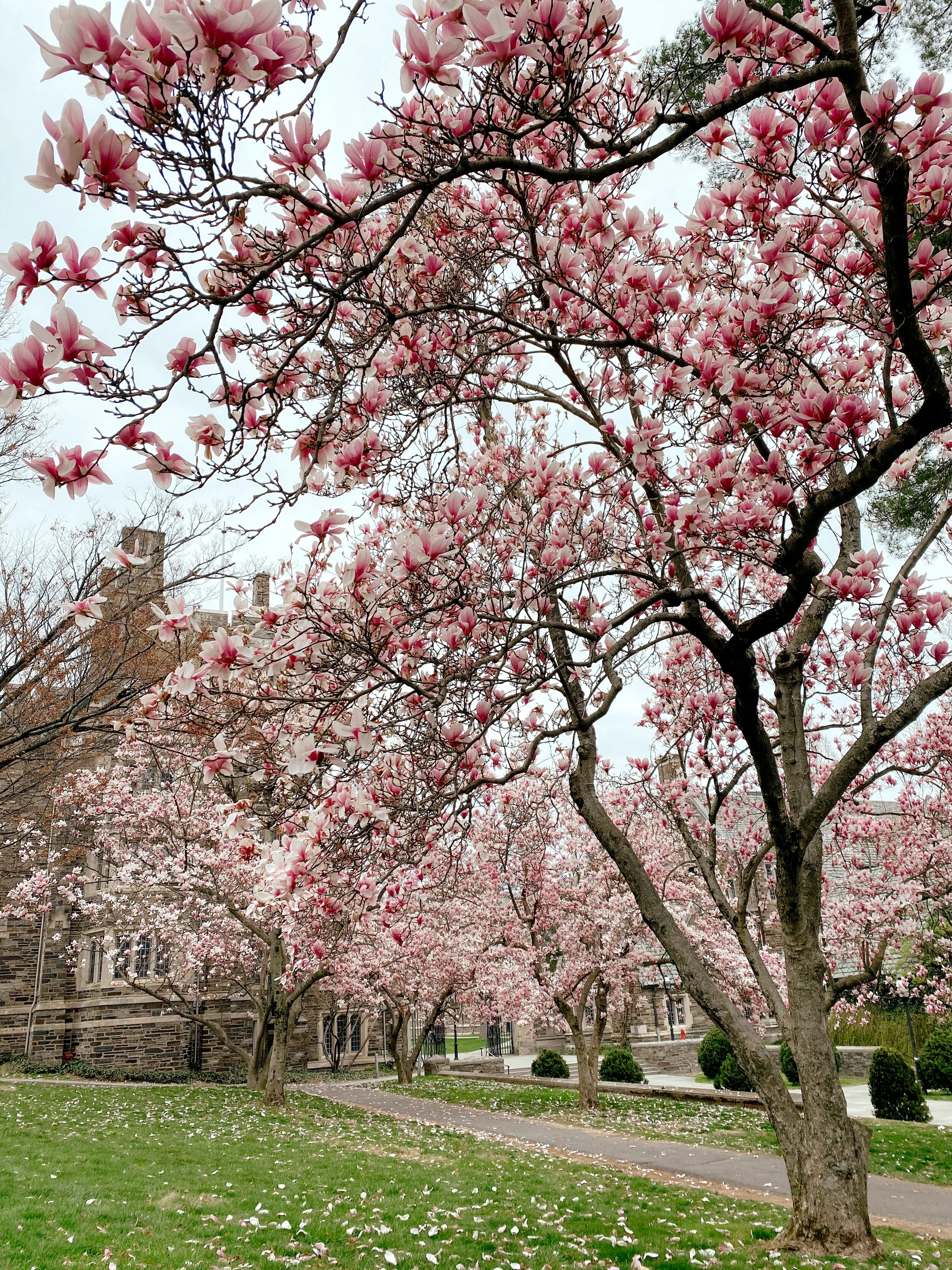 Right outside Nassau Presbyterian Church is a quiet manicured lawn with a flowering magnolia tree in a deep pink shade. It frames Holder Tower in the distance just perfectly. To the left of the church is a little brick path with a beautiful cherry blossom tree, and it’s something magical when you happen upon this spot at just the right time in April when the white petals are floating down, covering the ground like cheerful confetti.