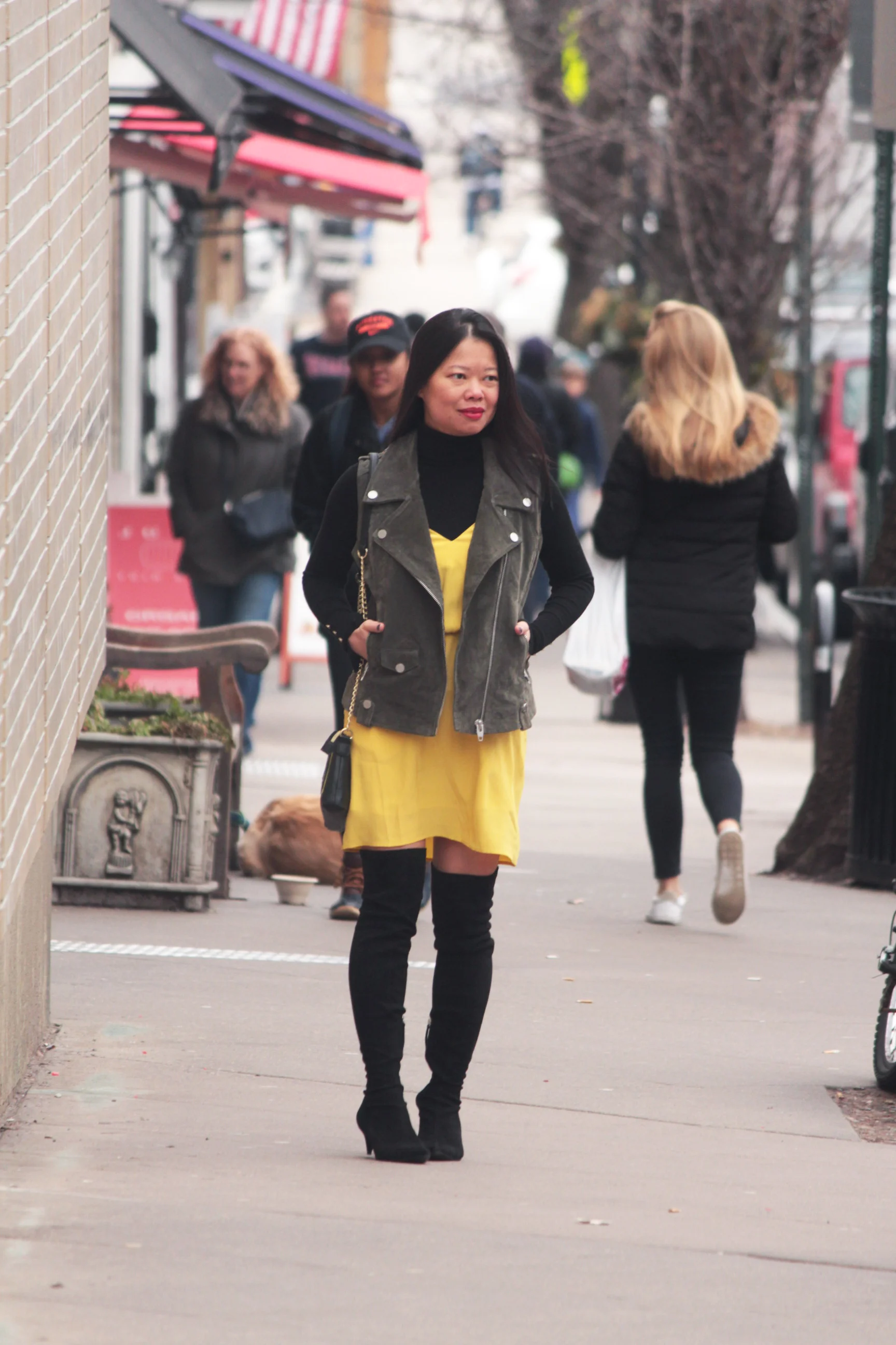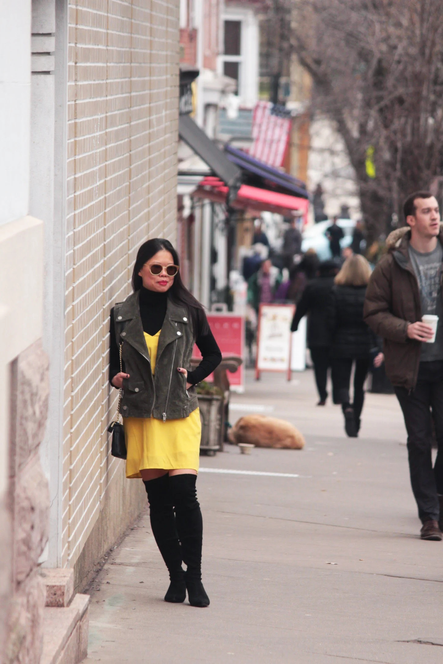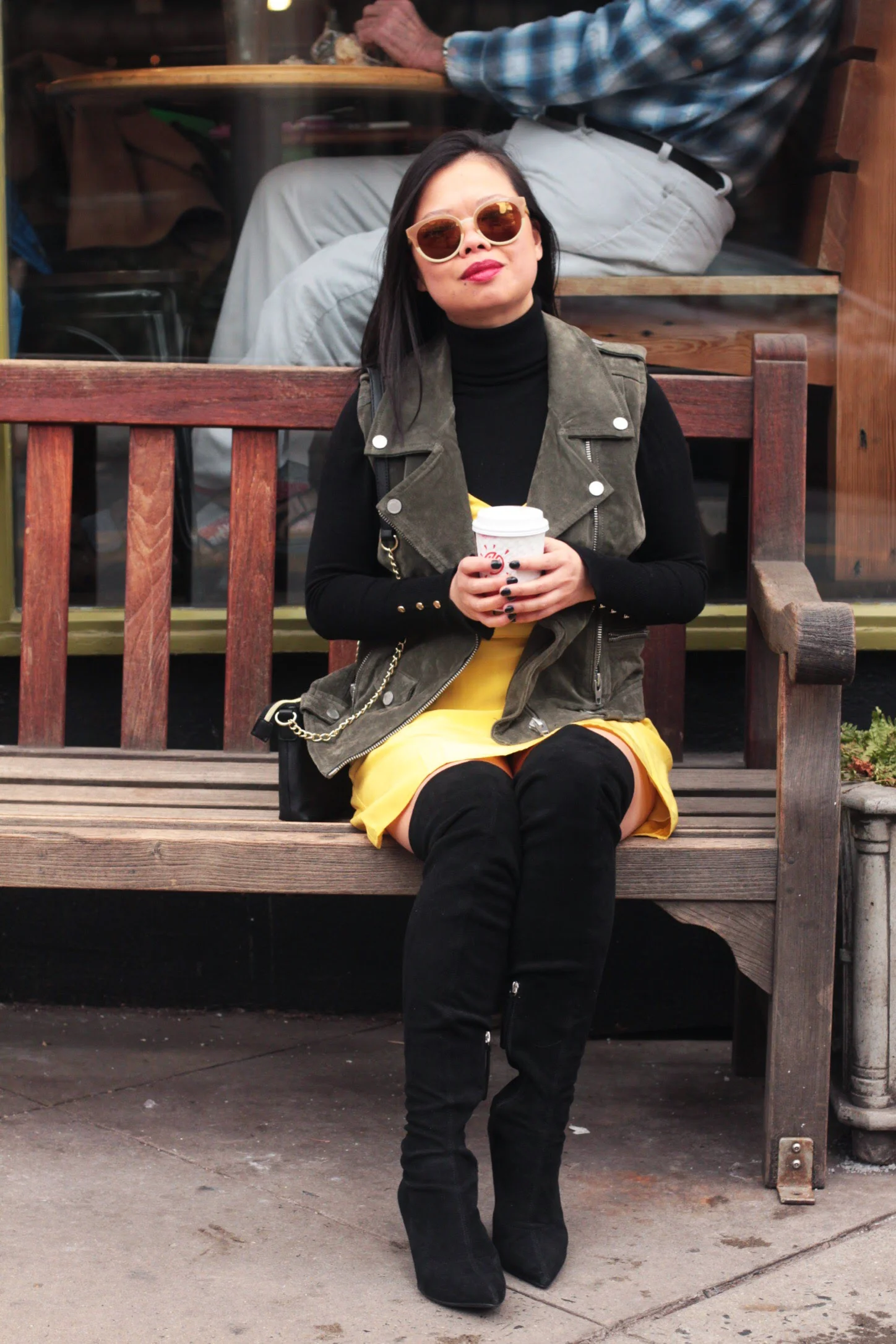 I'm dreaming of hot summer nights and even though we still have 9 days left of winter before spring (but who's counting?), that doesn't mean your summer frocks have to stay banished to the back of your closet. This winter season has been so unpredictableβone day it is 30 degrees and snowing and the next it is 75 degrees and rainy. The best way to "winterize" a summer dress, and to beat Mother Nature at her own game, is by layering. Here I have three layers on top (basic turtleneck, silk dress, and suede moto vest) and I feel ready to take on a 42 degree day. Of course, it helps to have a steaming hot cup of cocoa. (My poison of choice lately is the Mexican hot chocolate from Small World Coffee in Princeton. To.Die.For!)
