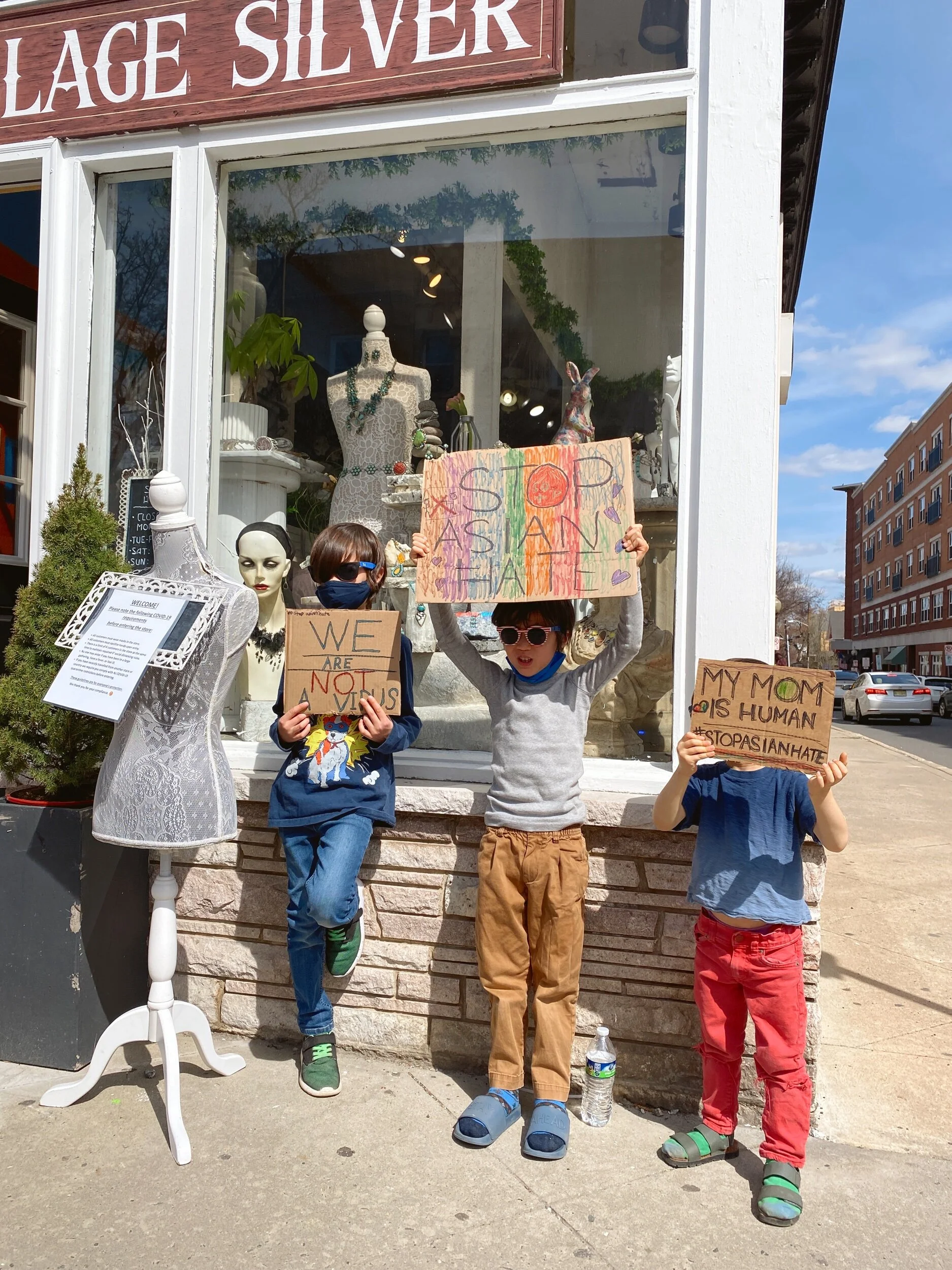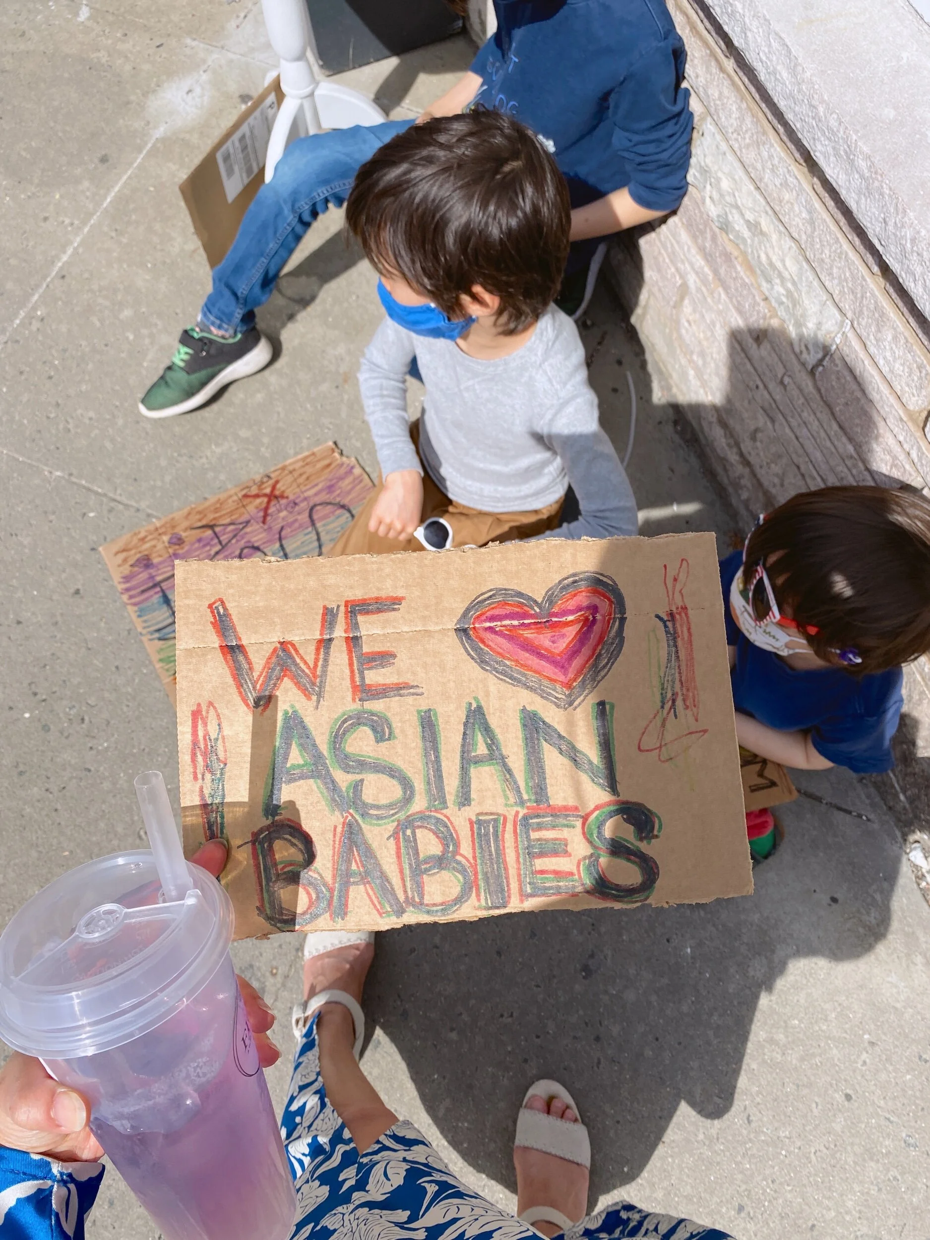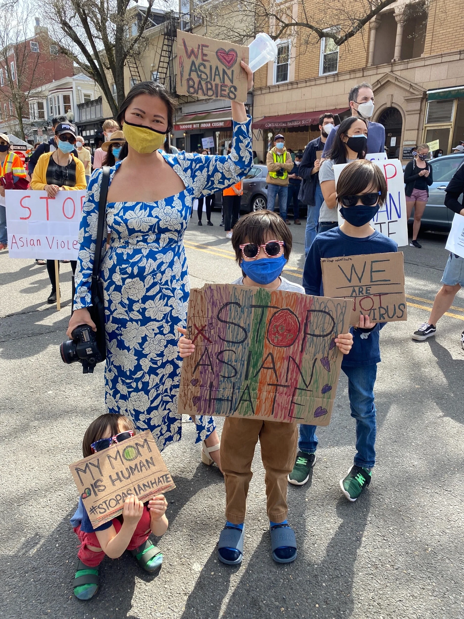 Last month was Asian American and Pacific Islander Heritage Month, so in honor of this, I wanted to share about our family’s participation in the Stop Asian Hate Rally & Vigil in Princeton, NJ in March, which took place just shortly after the senseless shooting of 6 Asian women at an Atlanta spa. This rally was a symbol of why we must all rise up to not only #StopAsianHate, but to proactively protect our Asian communities. I loved introducing my boys to their first social justice rally and seeing them take pride in our heritage. As a first-generation daughter of Chinese immigrant parents, who is raising four biracial children, I felt so proud of my boys on this day, their compassion, and their thoughtfully handmade signs. (The boys came up with their signs all on their own, even making one for baby Helena – “WE LOVE ASIAN BABIES” – but she was feeling sick that day and didn’t come.) The energy at the rally was high, and the turnout in the Princeton community was so, so good.