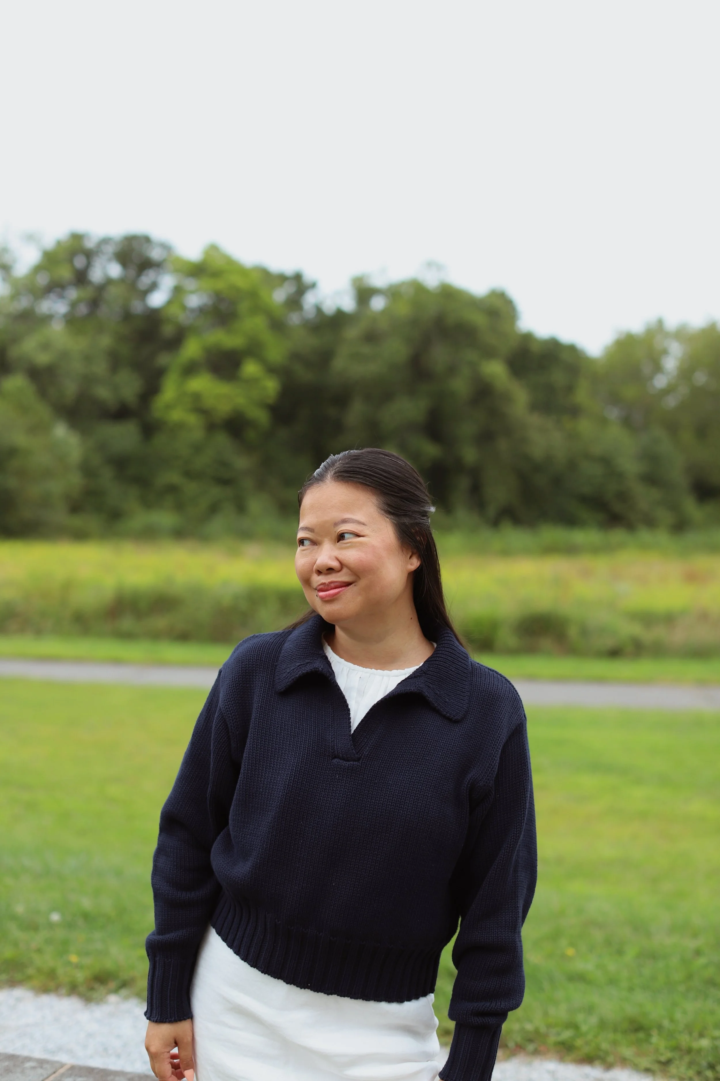 Linen blend maxi skirt: Anthropologie; 100% Organic Cropped Cotton Polo Sweater: Quince